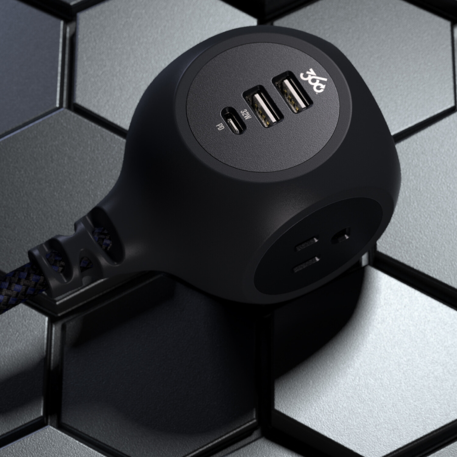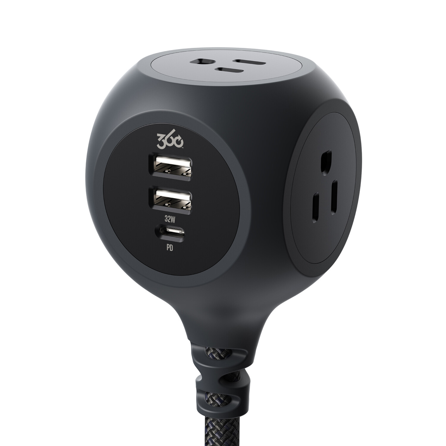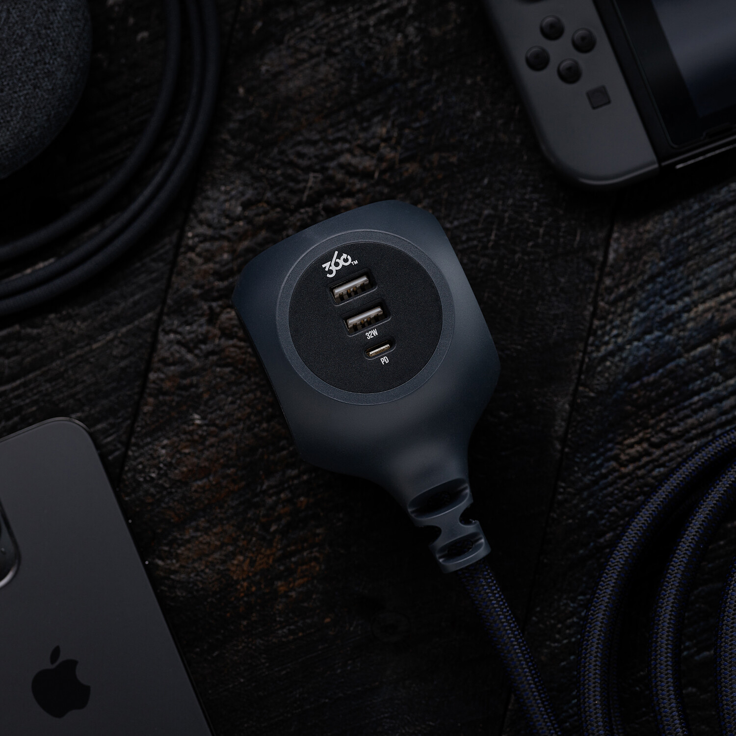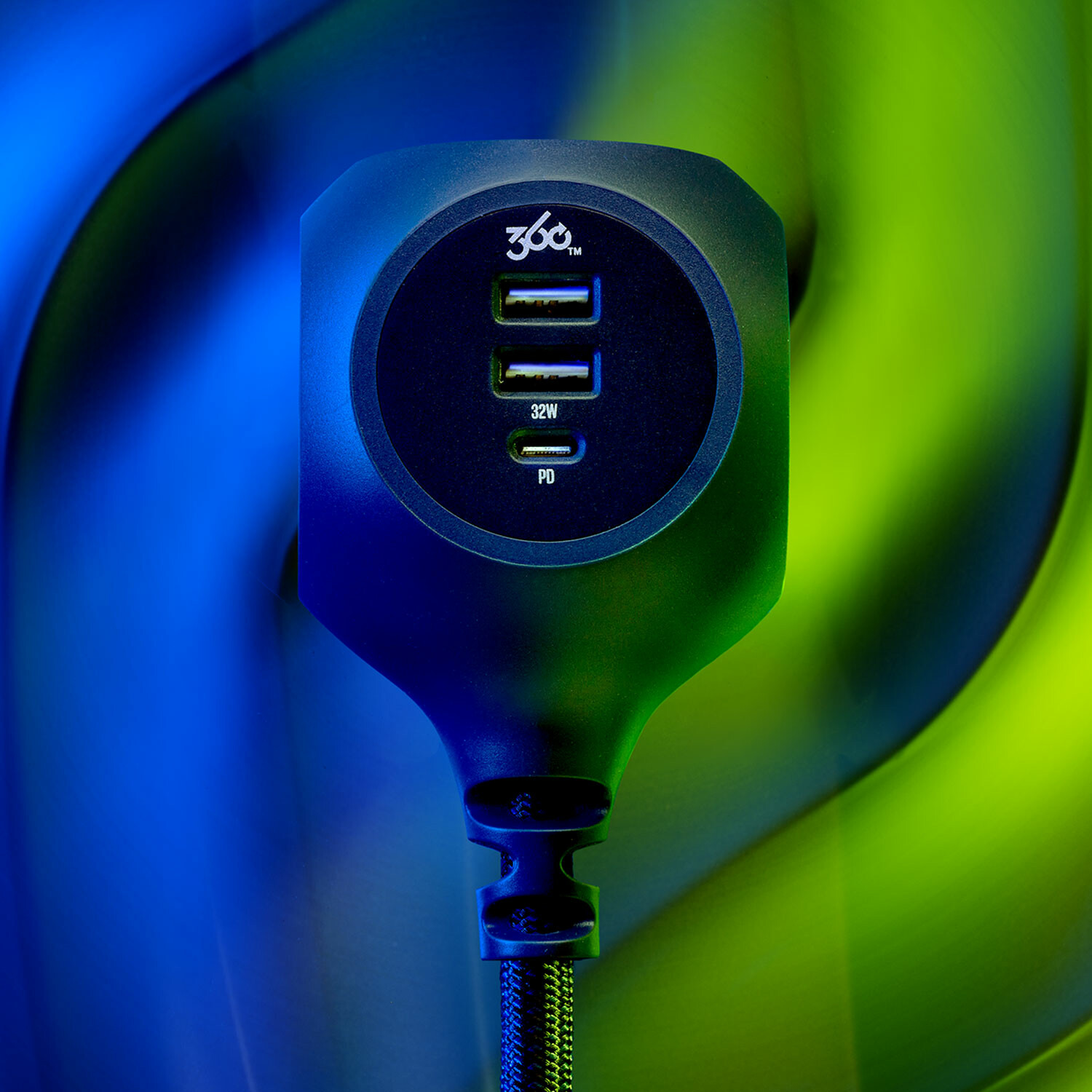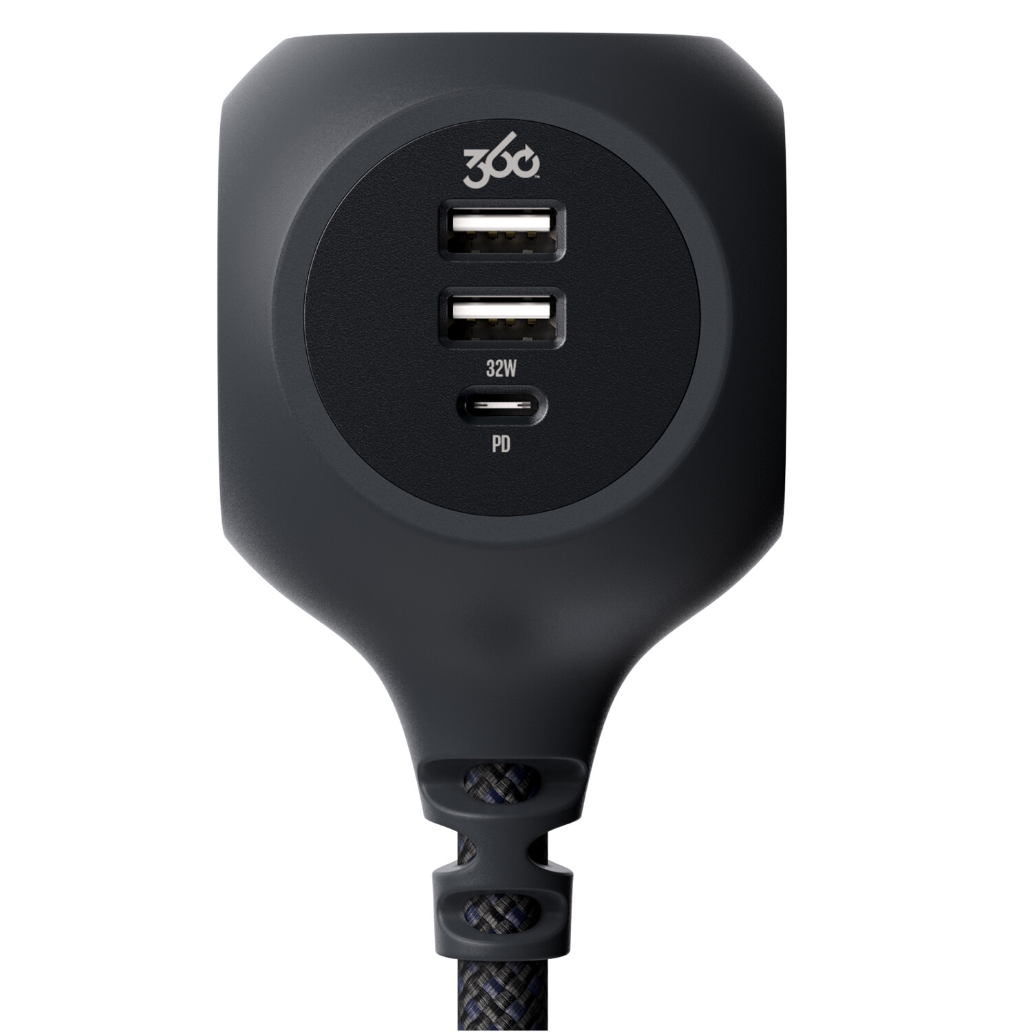 The PowerBall32 // 32W // 8ft // Braided 3-Outlet Hub + 2 USB-A + 1 USB-C delivers powerful, versatile charging in a durable, space-saving design. With Power Delivery and Charge Sense technology, it intelligently manages output to keep laptops, phones, and multiple devices charging efficiently. The braided Fusion Weave cord and offset plug make it built for flexibility and everyday convenience.