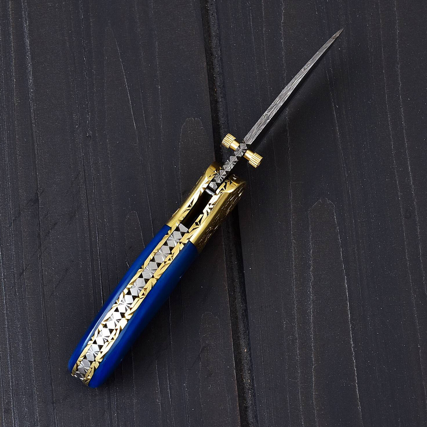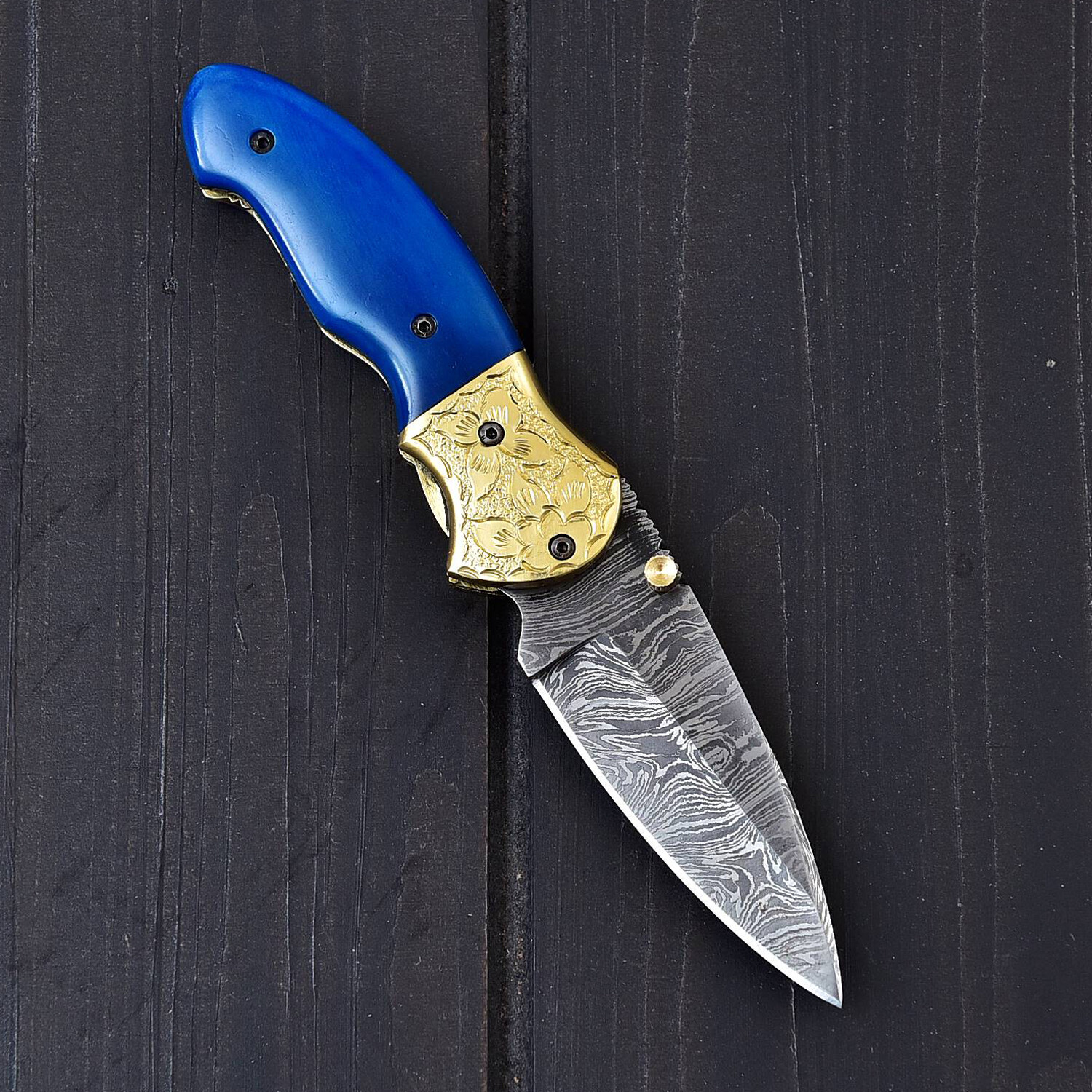 — Handle Material: Hand Engraved Brass Bolsters With Dyed Color Bone & Mosaic Pins Inserted