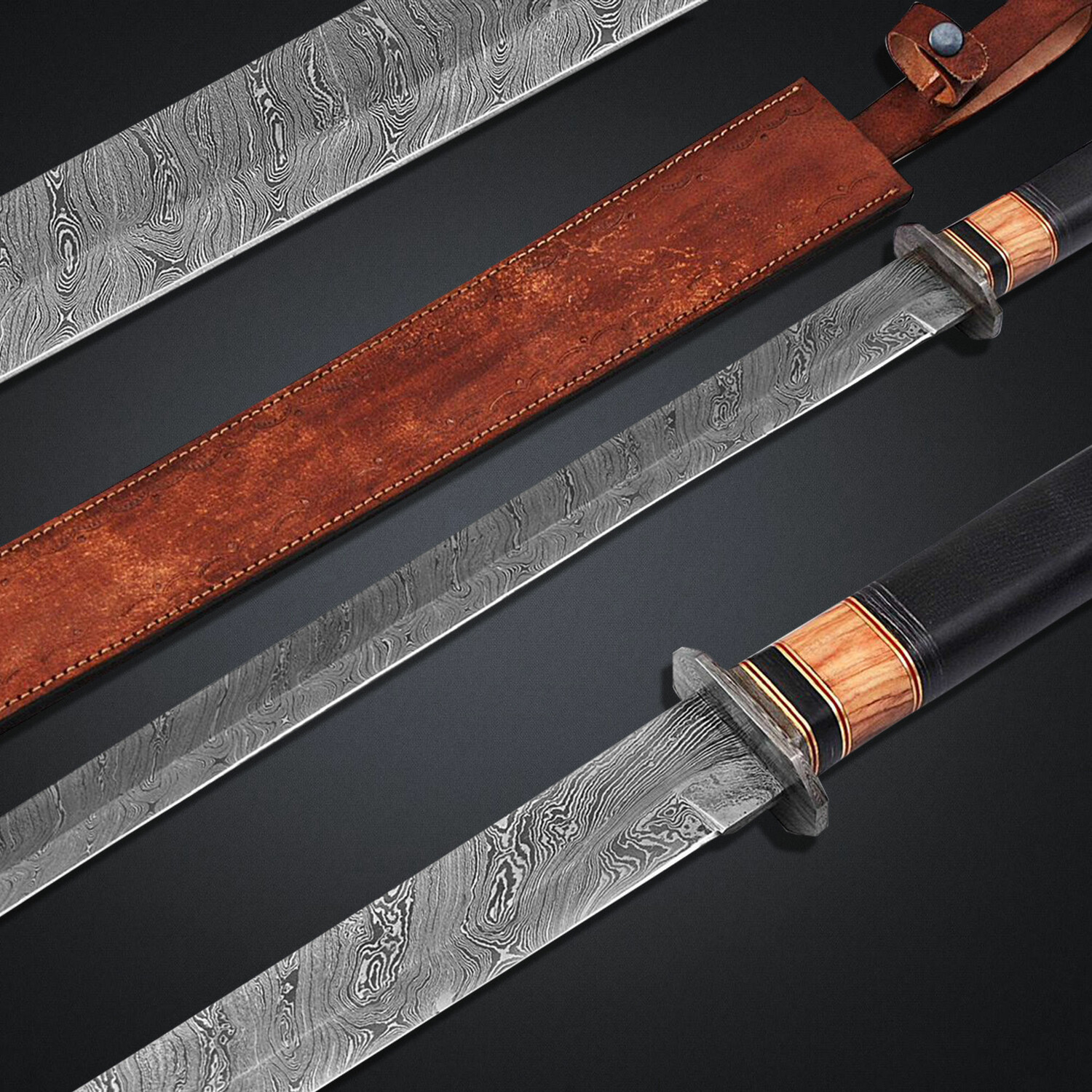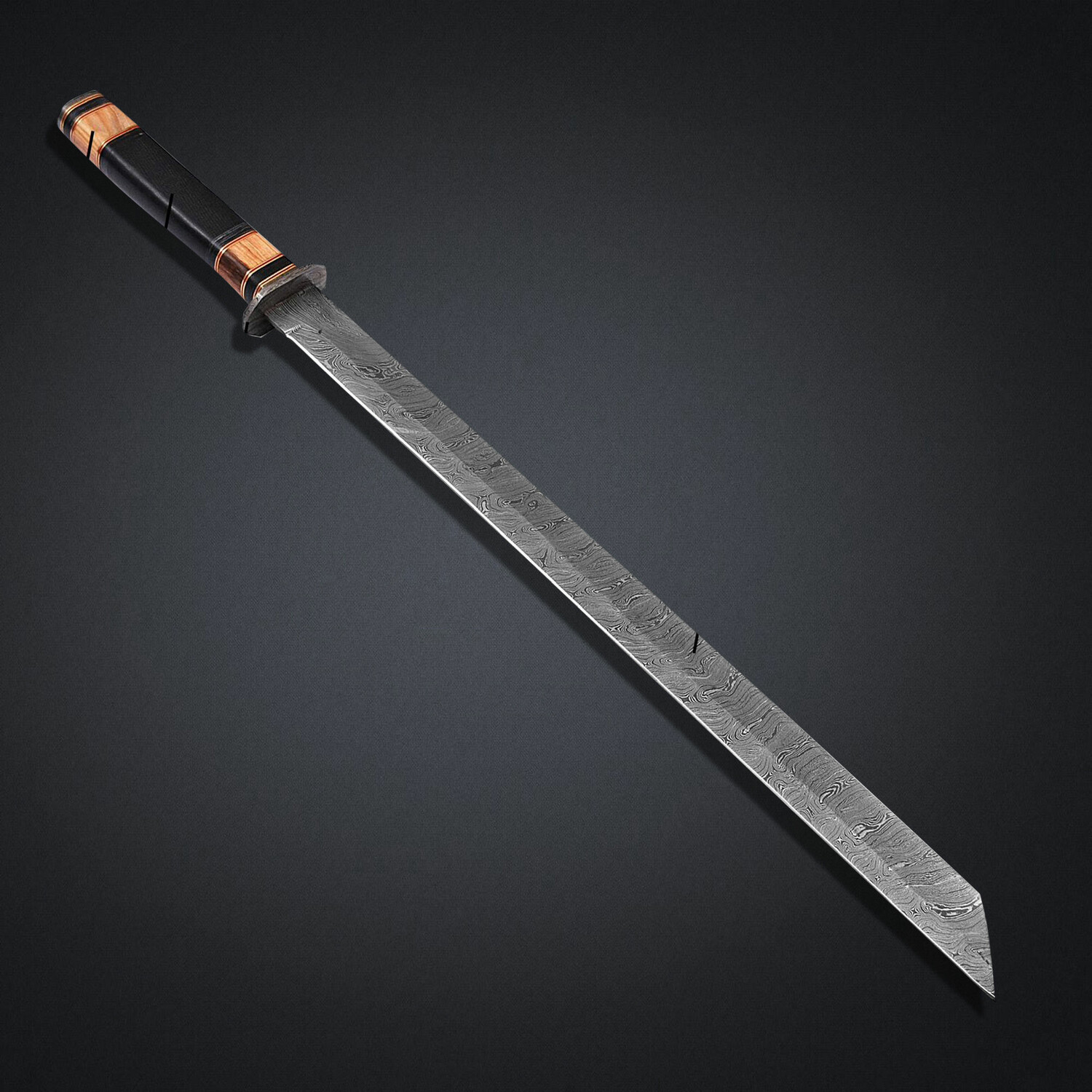 This sword is made from pattern welded Damascus steel. Pattern welded Damascus steel is a hard heat treated, folded carbon steel. There are 11 pieces of steel, folded five times, making 352 layers. The steel is the perfect combination of hardness and durability with a Rockwell hardness rating between 55 and 56 HRC.