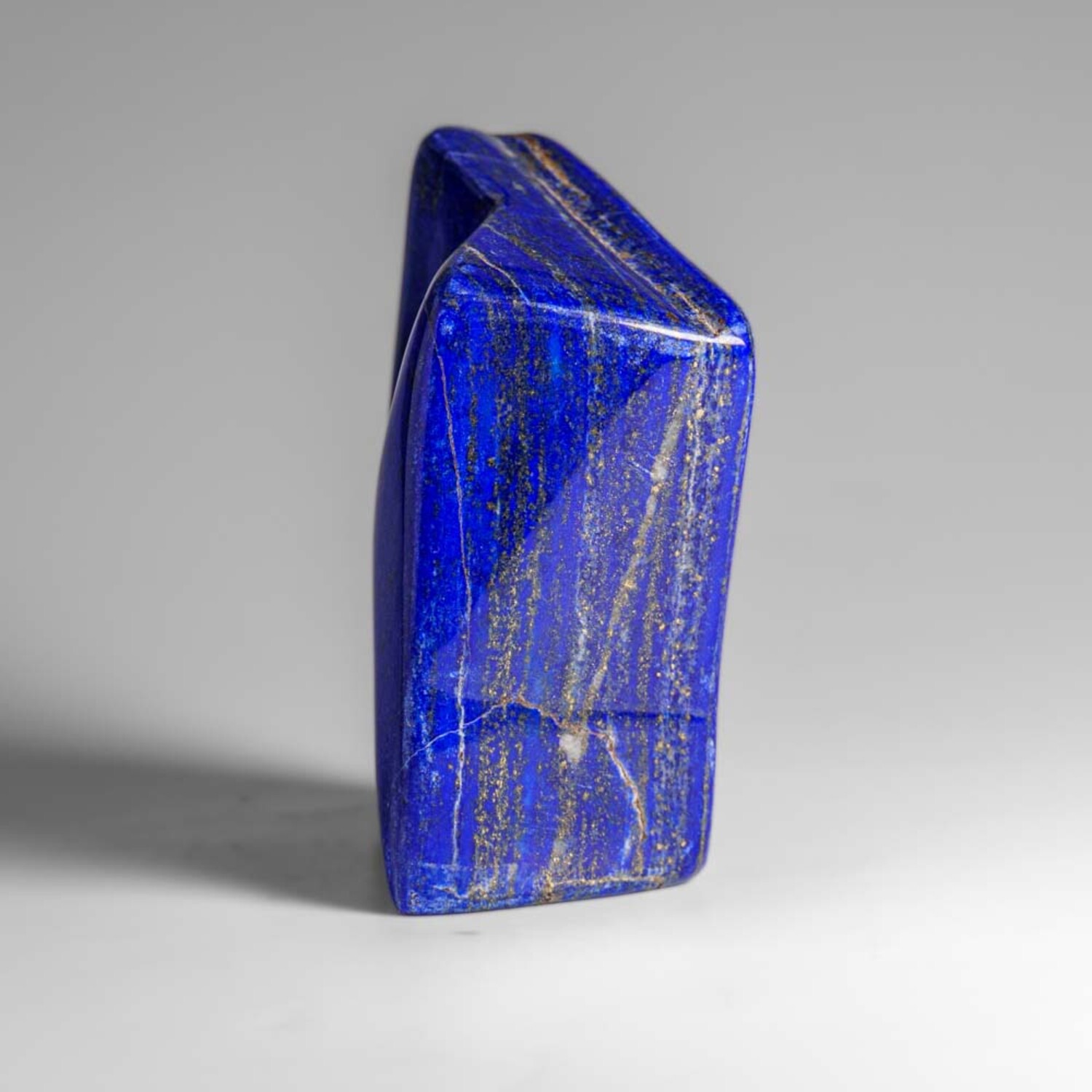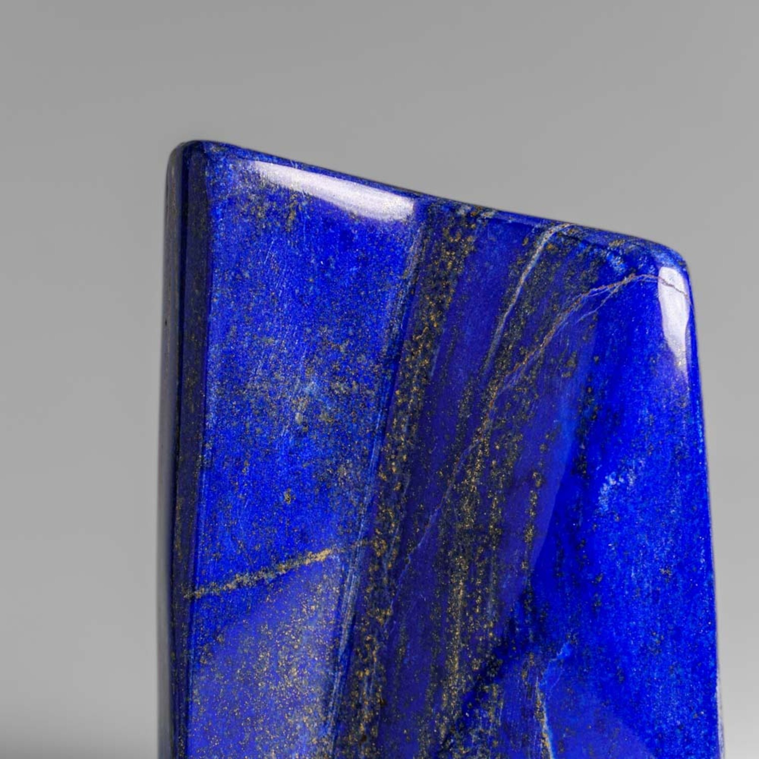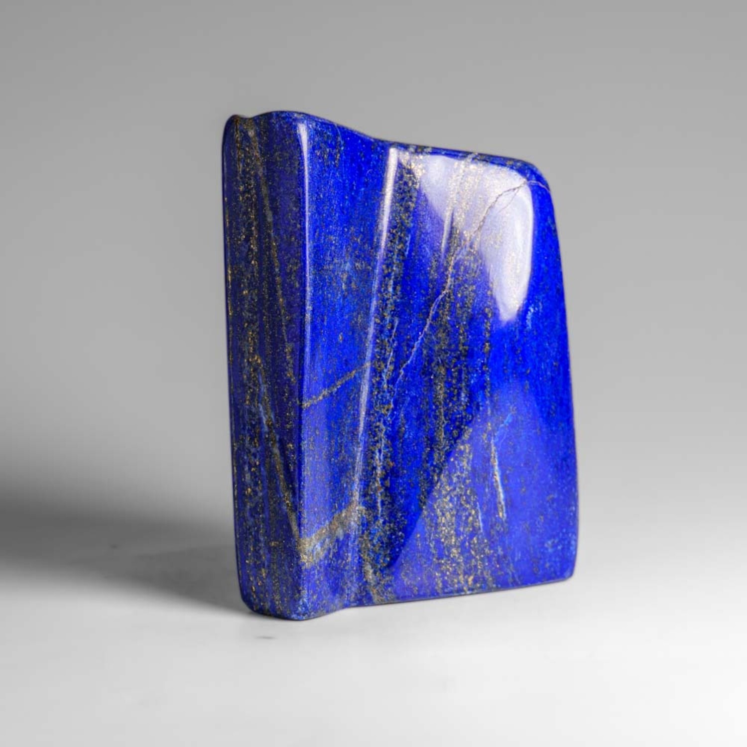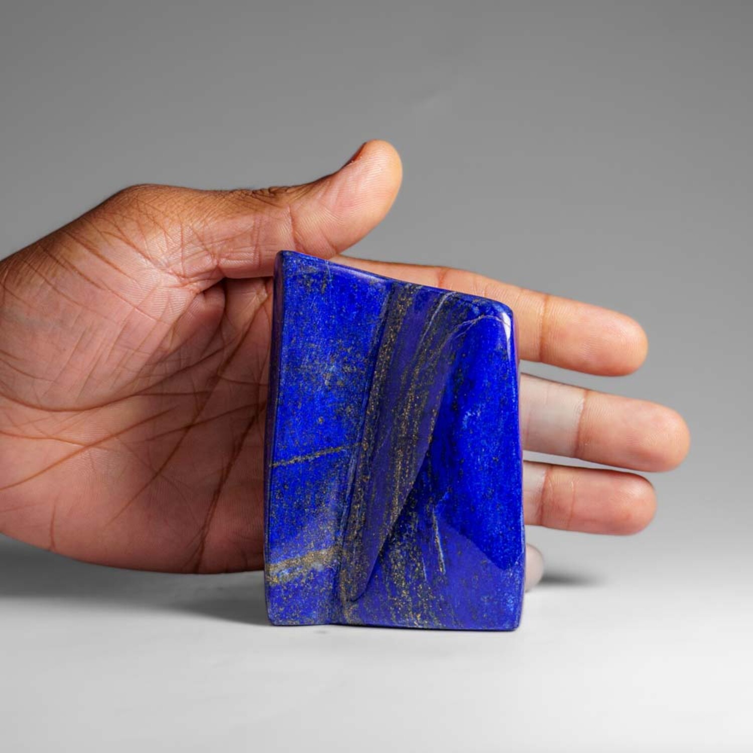 Beautiful hand-polished free form of AAA quality natural Afghani lapis lazuli. This specimen has rich, electric-royal blue color enriched with scintillating pyrite micro-crystals. Lapis Lazuli is a powerful crystal for activating the higher mind and enhancing intellectual ability. It stimulates the desire for knowledge, truth and understanding, and aids the process of learning. It is excellent for enhancing memory.