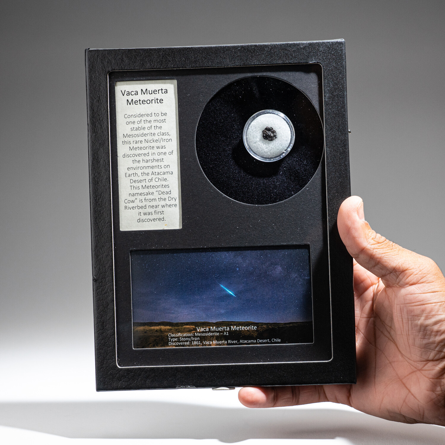 Genuine Vaca Muerta Meteorite in a Glass Display Box. This specimen comes in a labeled display box with color image and a brief written description. These make amazing gifts as they come perfectly displayed and labeled.