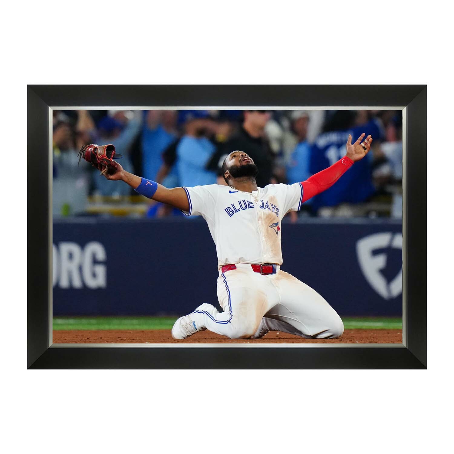 Celebrate the defining moment of Toronto’s return to glory with this stunning framed canvas of Vladimir Guerrero Jr. captured in triumph. Measuring 33.5 by 23.5 inches, this powerful image immortalizes Guerrero Jr. as he drops to his knees in jubilation after Game 7 of the ALCS — when the Blue Jays defeated the Seattle Mariners to advance to the World Series for the first time since 1993. A vivid tribute to heart, passion, and history in the making, this piece is a must-have for every Blue Jays fan and collector.