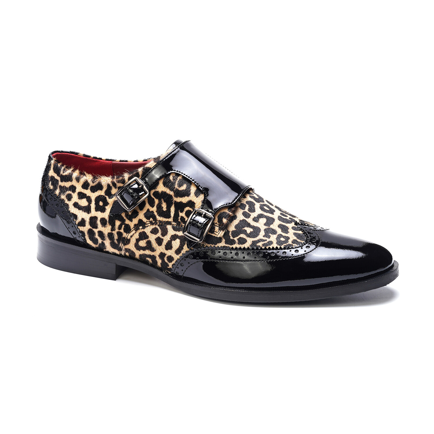 The Kai Double Monk combines a bold wild flair with sleek black patent leather, creating a striking and sophisticated look. With polished double buckles and a luxurious red interior, this shoe is perfect for making a statement.