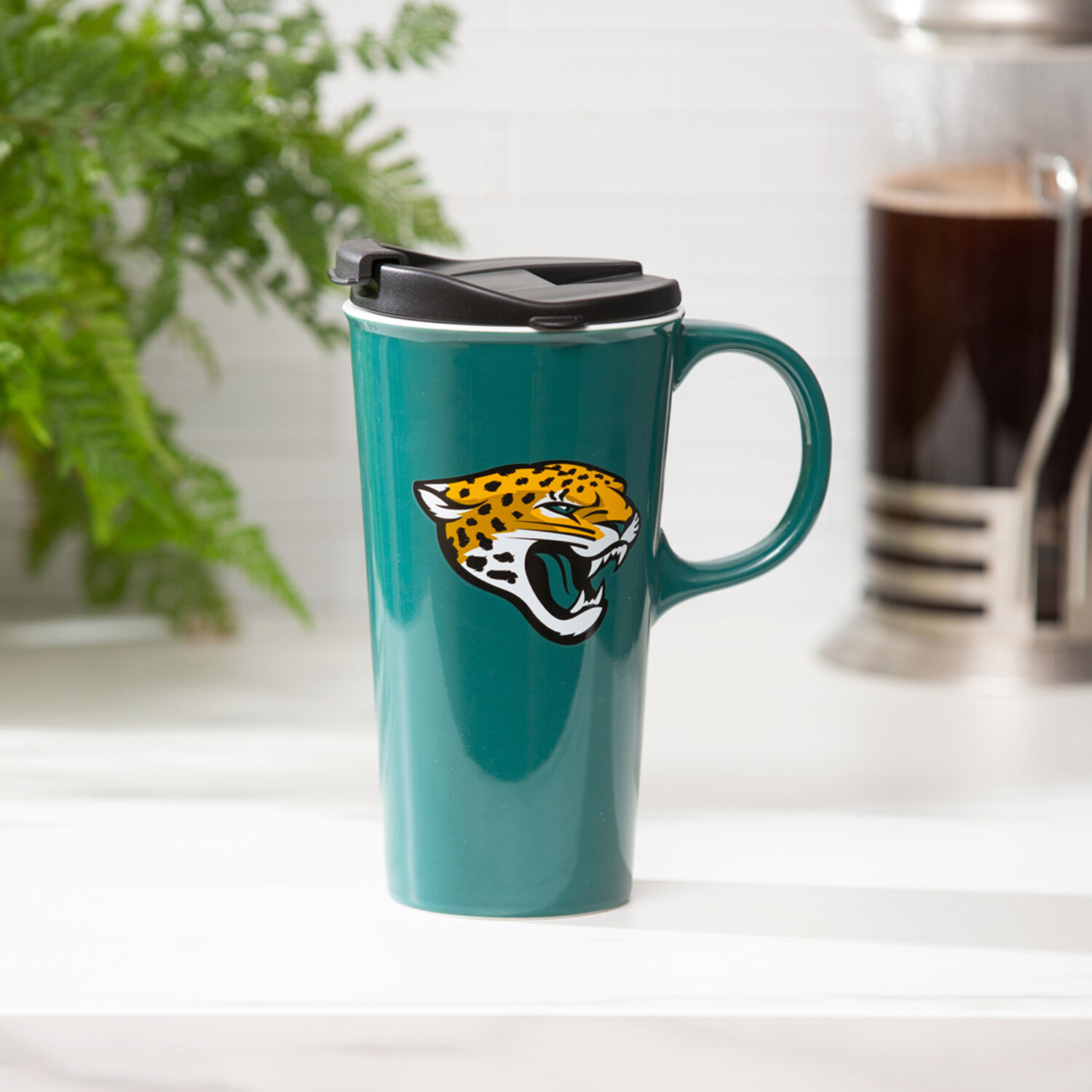 This gift boxed NFL team themed 17 oz. travel mug features a flip top lid, comfortable handle and is made of high quality ceramic. Suitable for hot or cold drinks. This mug fits most vehicle cup holders, is top shelf dishwasher safe and makes a great gift for any fan!