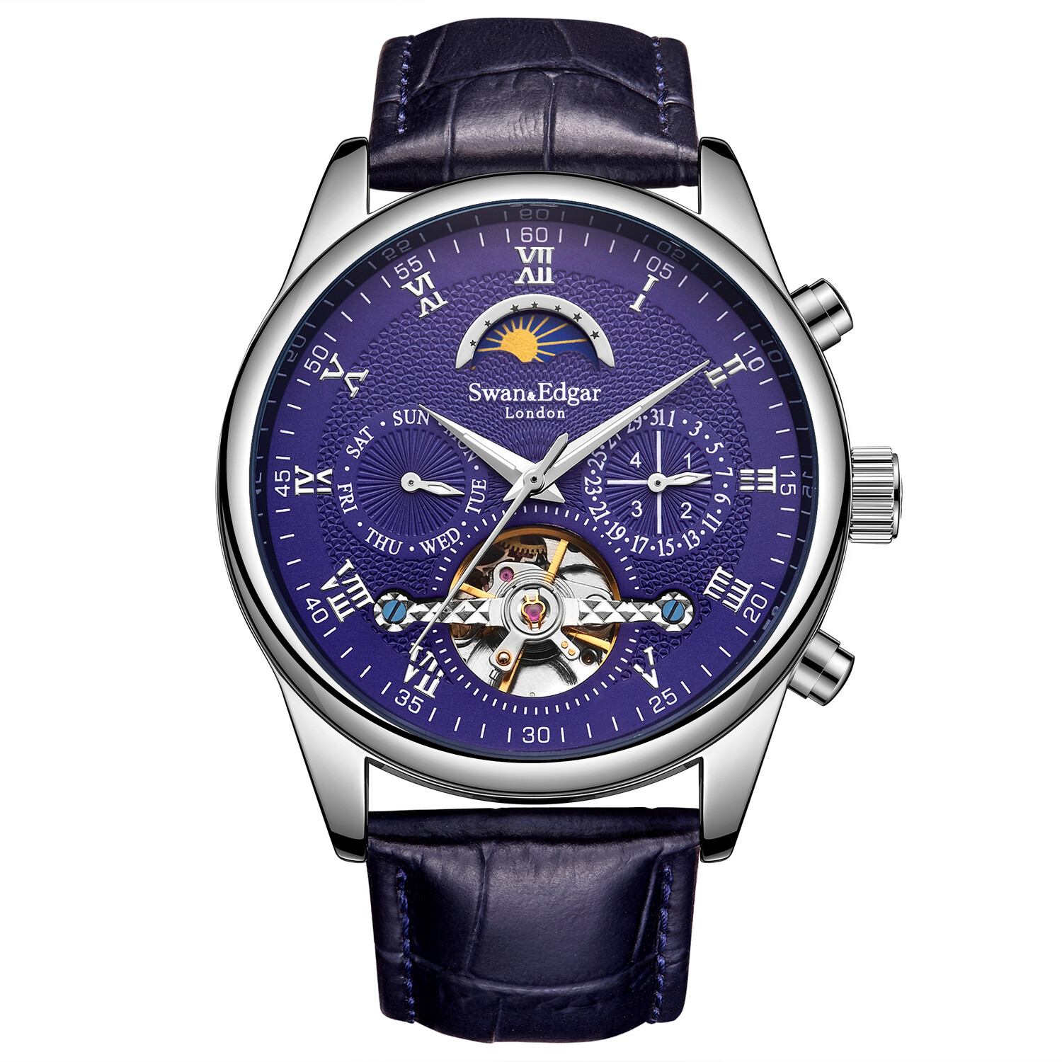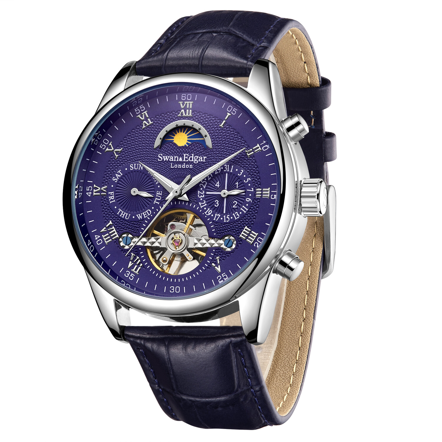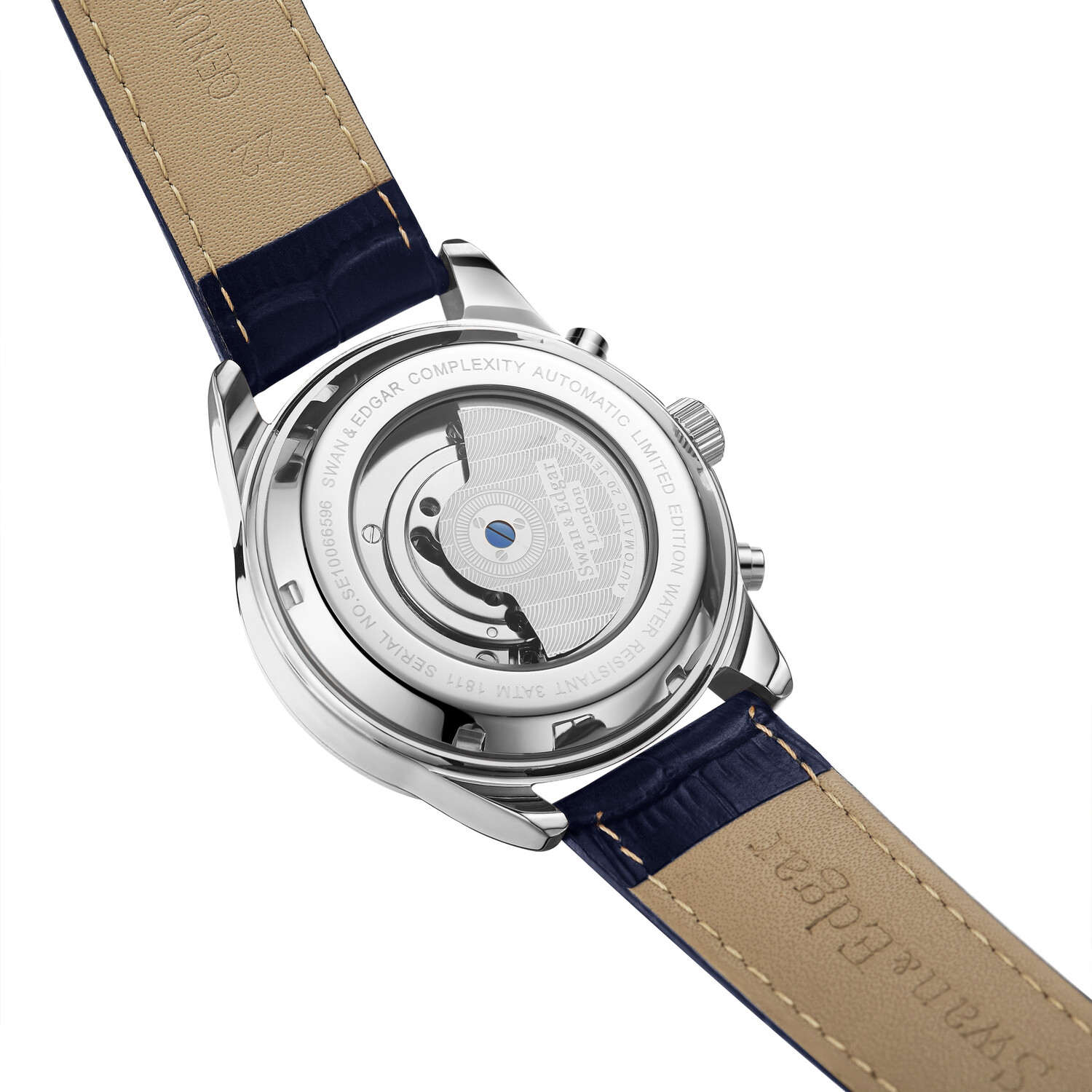 This timepiece is housed in a stainless steel skeleton caseback domed case, which supports its easy to grip serrated edge crown. This timepiece comes furnished with a comfortable hand waxed midnight blue leather strap and a Swan & Edgar etched logo buckle resulting in a highly detailed and luxurious collectable.