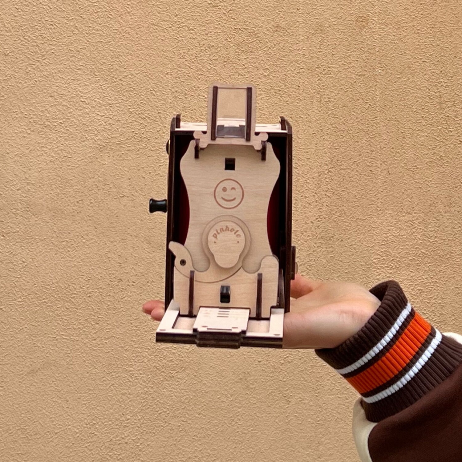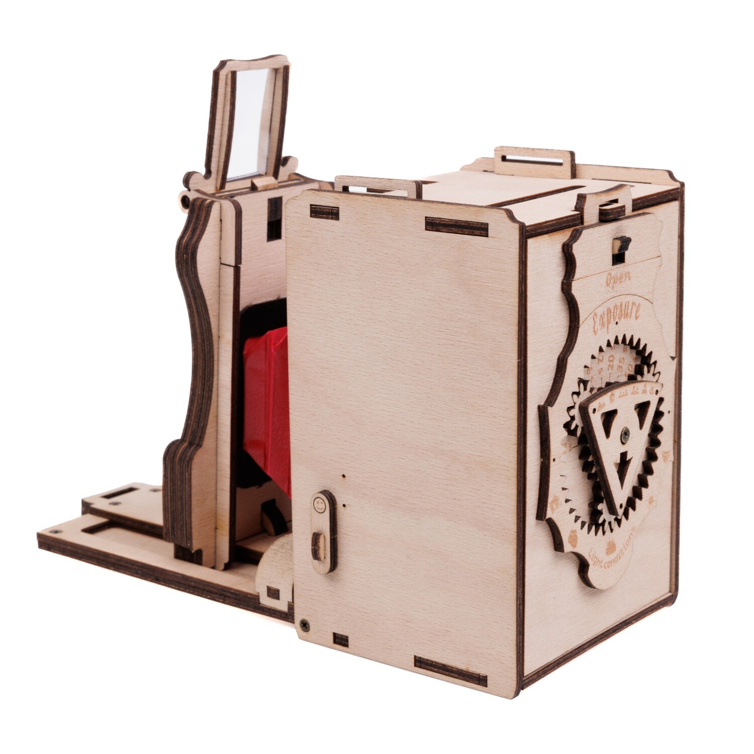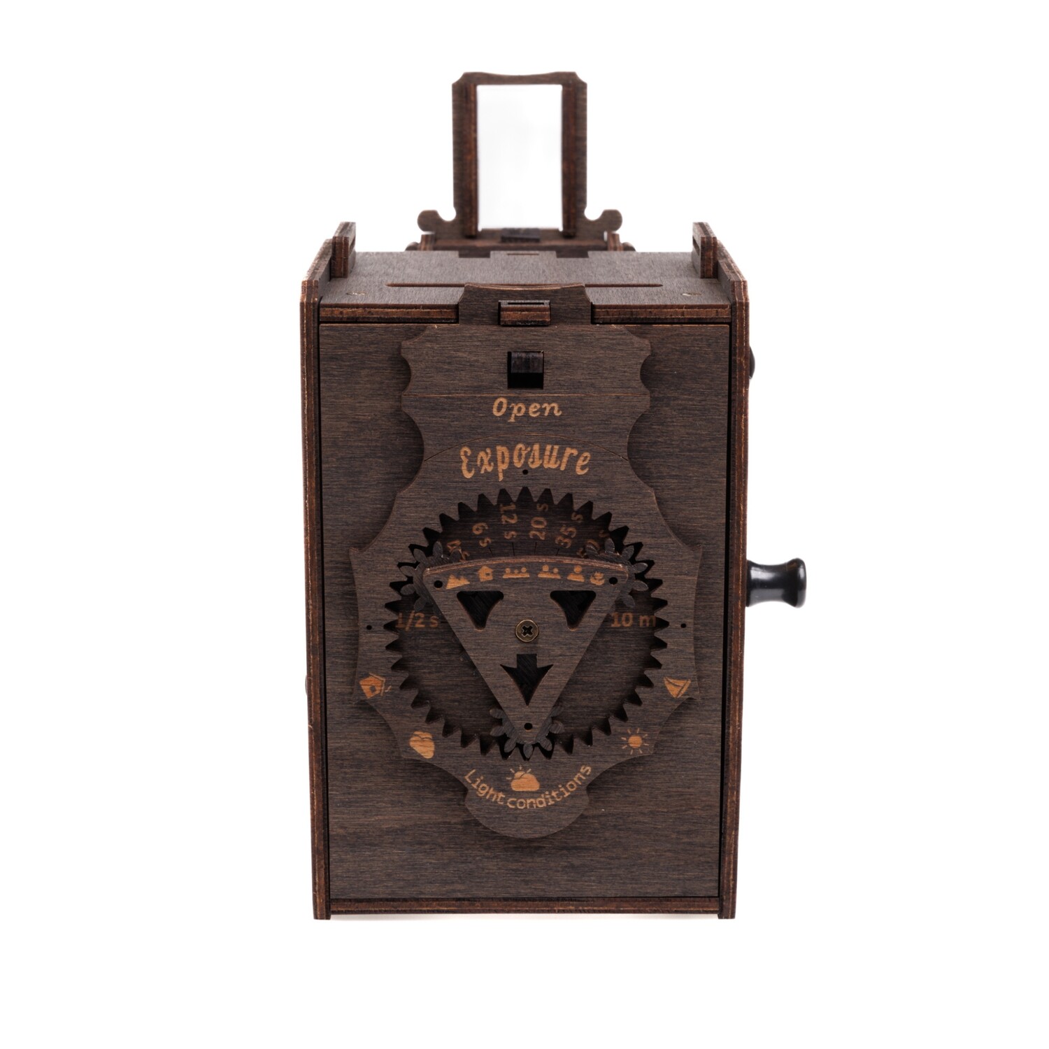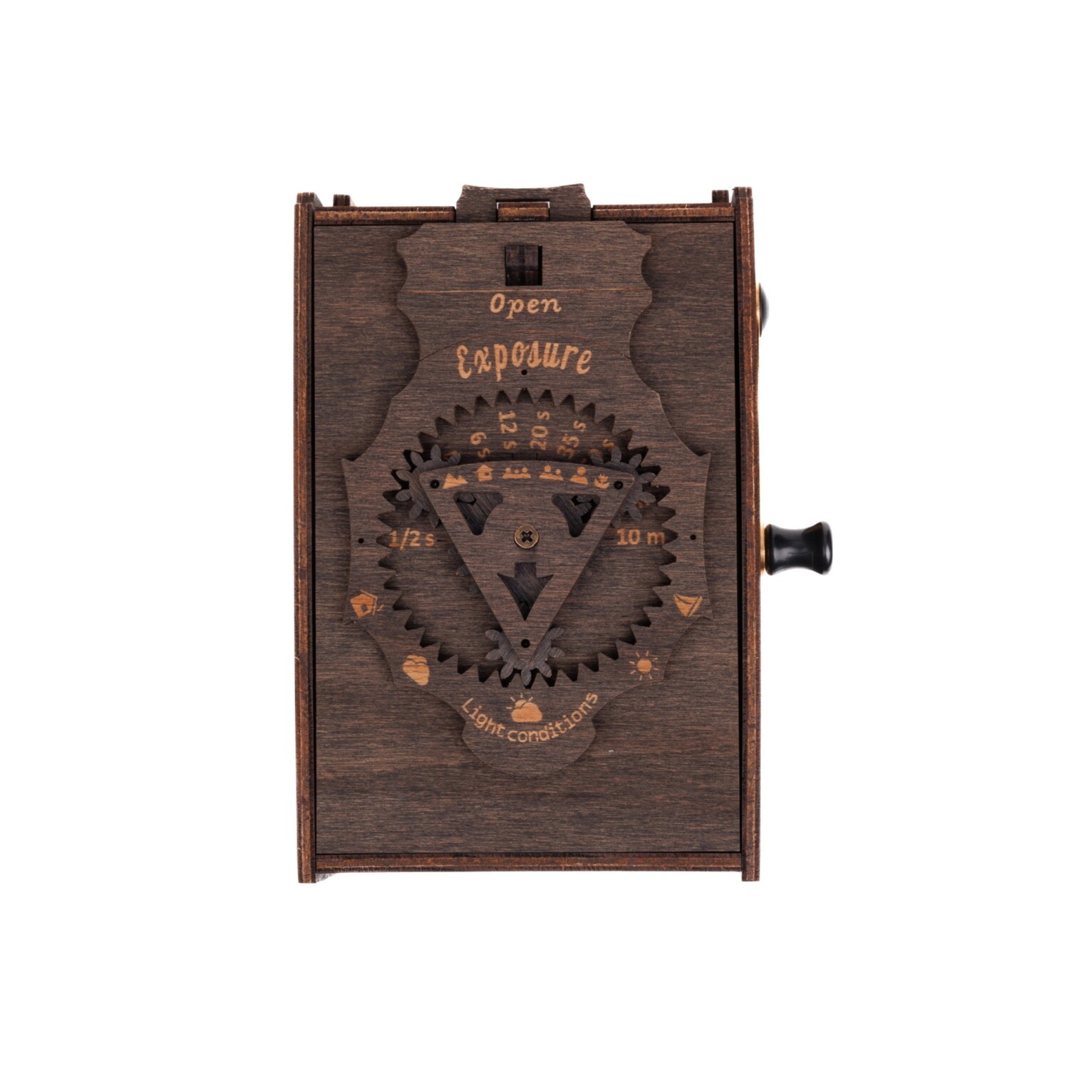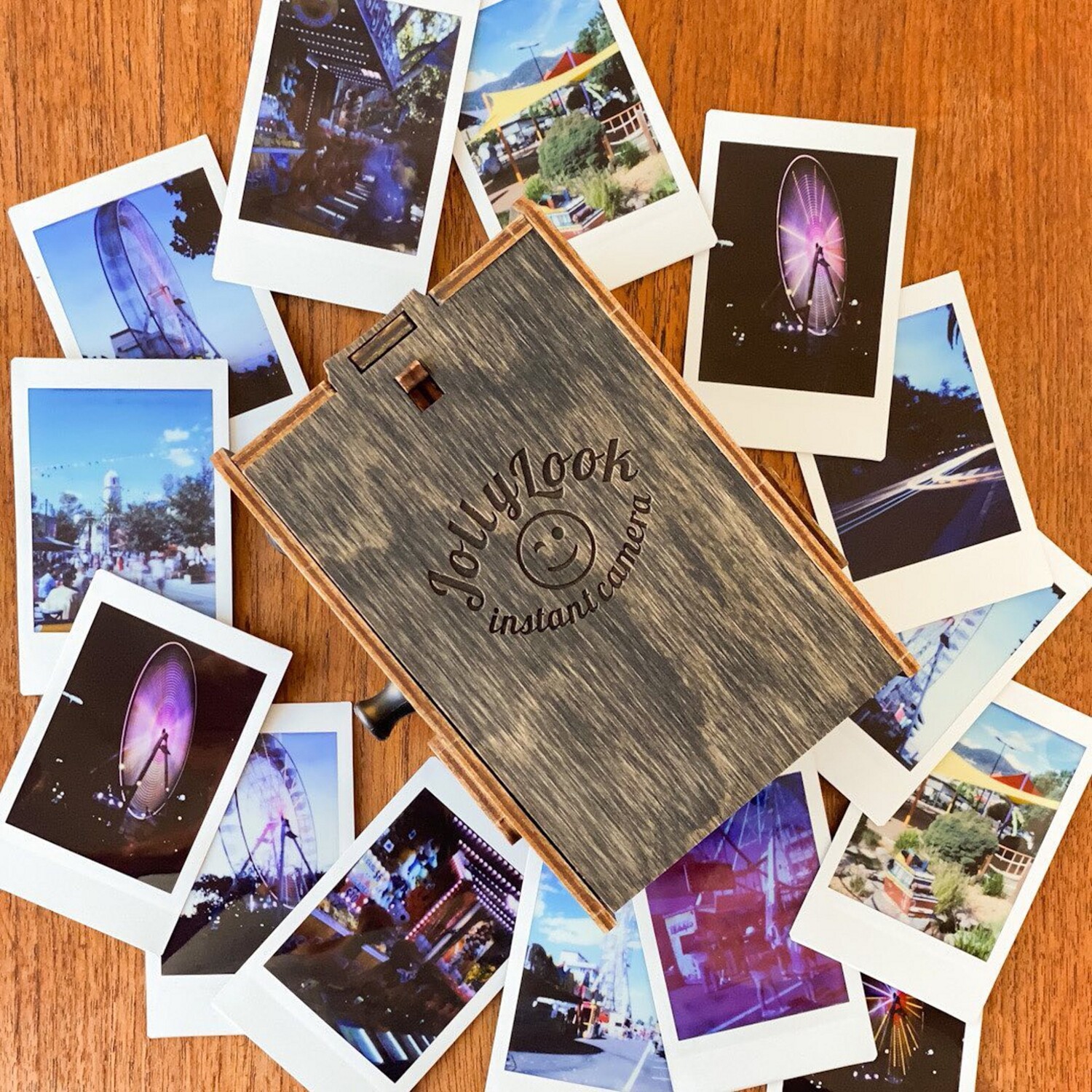 Handmade JollyLook Pinhole Instant Mini film Camera with variable focal length (40mm-110mm) enables wide-angle and telephoto pinhole images to be taken. Pinhole cameras do not require focusing, and moving the pinhole away from the film reduces the field of view and increases the effective F-stop. JollyLook Pinhole develops the images with the Jollylook manual development unit. The pinhole is a perfectly round hole in a copper foil with a diameter of 0.38 mm. Exposures are made by manually sliding the shutter open and close. The body of the JollyLook Pinhole zoom is made from easily recyclable, biodegradable natural wood.