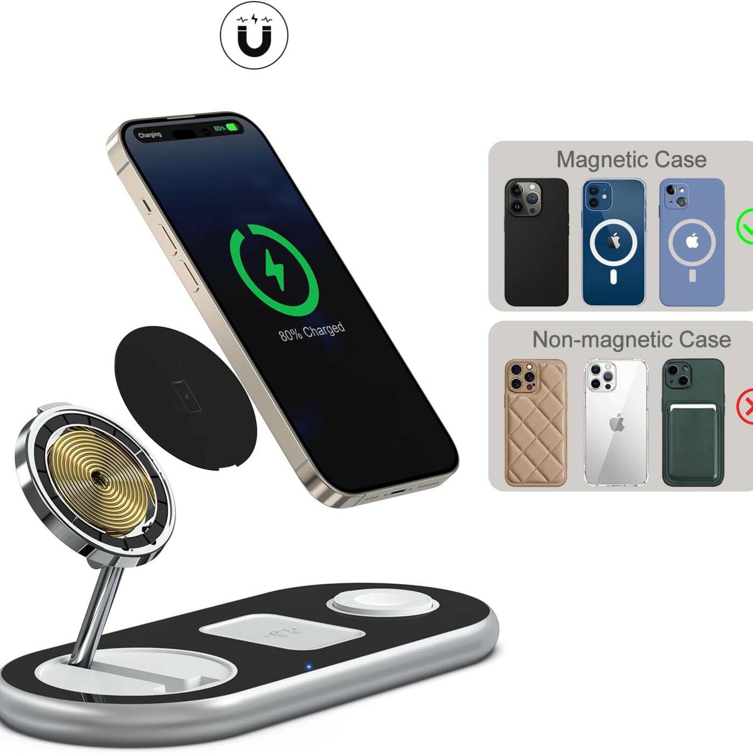 — 3-in-1 Fast Wireless Charger for iPhone: Charges iPhone 16, 15, 14, 13, and 12 Series from 0% to 100% in 2–3 hours—almost as fast as the original MagSafe charger (charging speed may vary with battery condition and ambient temperature). For best results, use without a case or with a MagSafe-compatible case.