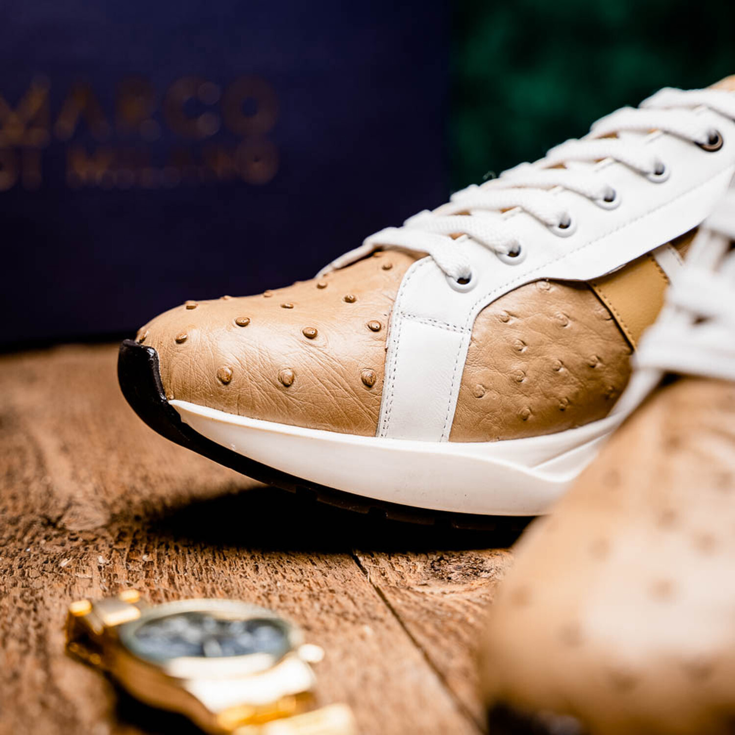 Genuine ostrich quill and smooth calfskin fashion sneakers made to hit the streets. Full leather cushioned interior and a chunky rubber outsole makes for a statement shoe with supreme comfort.