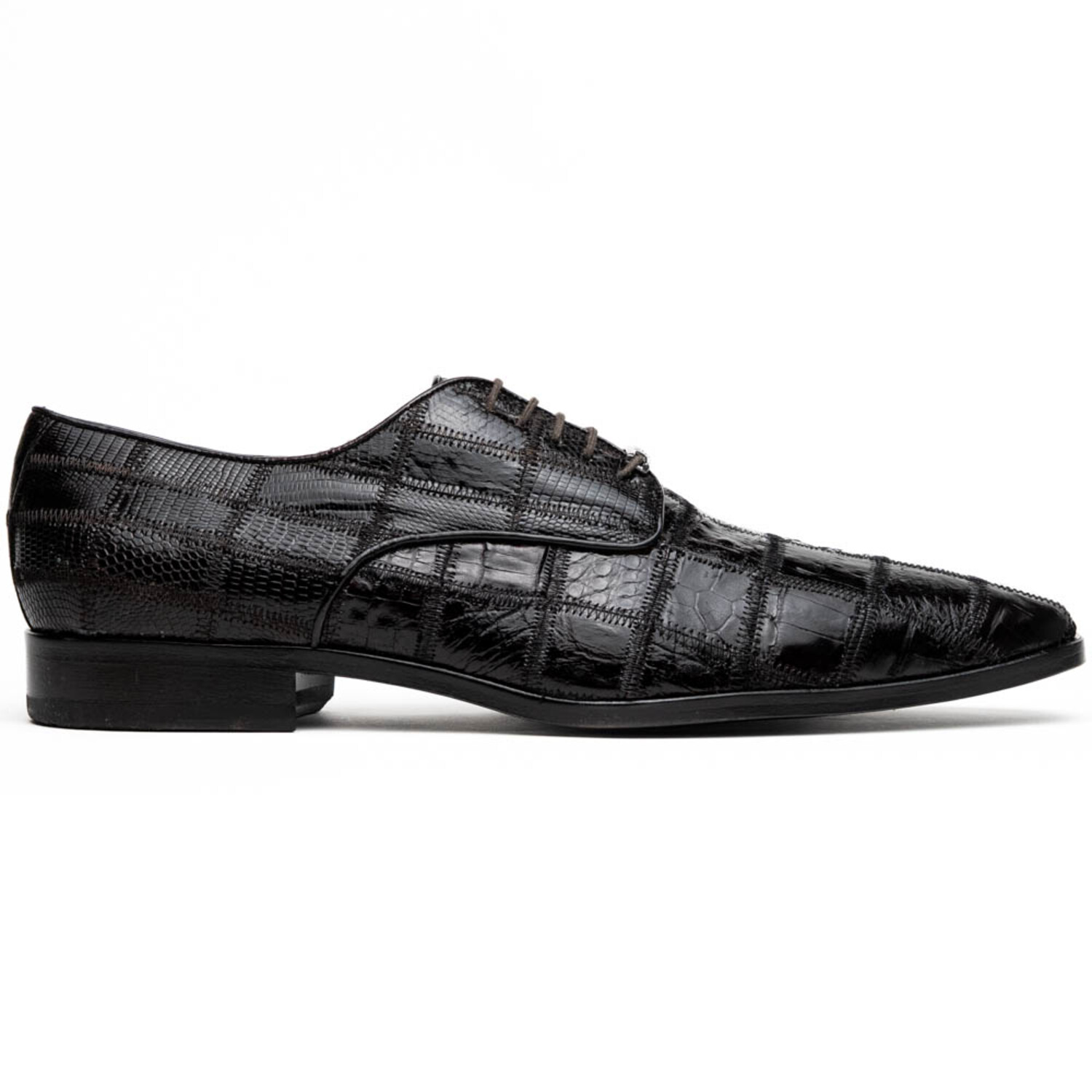 The PISSA Derby is a masterfully handcrafted dress shoe made from genuine caiman crocodile and lizard skin, stitched in an intricate patchwork pattern that showcases the rich contrast of textures and color tones. Its sleek silhouette is complemented by a contrasting lace panel and a hand-painted leather sole, uniquely dyed to match and engraved with the Marco Di Milano signature. A true statement piece for the discerning gentleman, blending bold design with classic luxury.