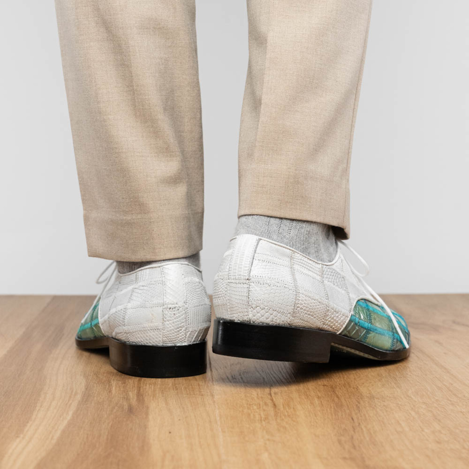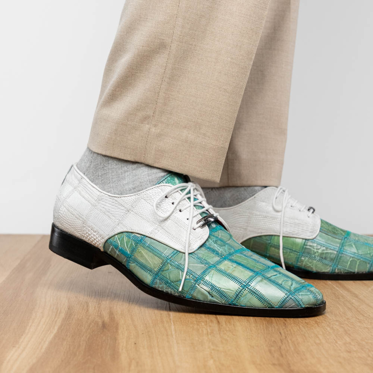 Pissa // Caiman Belly + Lizard Ring Skin Leather Derbys // Teal + White