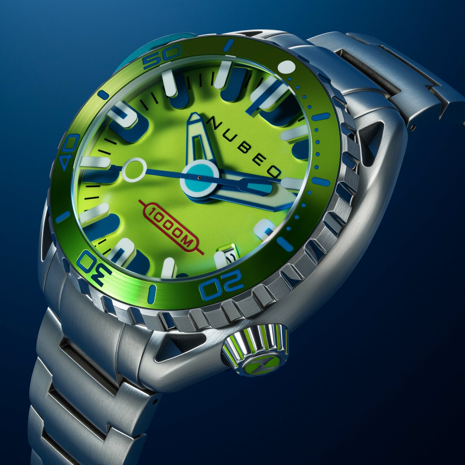 COLLECTION: ALUMINAUT MODEL: NB-6115-33 MOVEMENT: JAPAN AUTOMATIC CASE MATERIAL: STAINLESS STEEL CASE DIAMETER (MM): 50 CASE THICKNESS (MM): 22 CASE SHAPE: ROUND CASE COLOR: STAINLESS STEEL DIAL COLOR: GREEN BAND: STAINLESS STEEL BAND COLOR: STAINLESS STEEL BUCKLE: FOLD OVER BUCKLE WITH SAFETY LOCK AND PUSH BUTTON BAND WIDTH (MM): 20 WATER RESISTANCE: 100 ATM WARRANTY: 2 YEARS