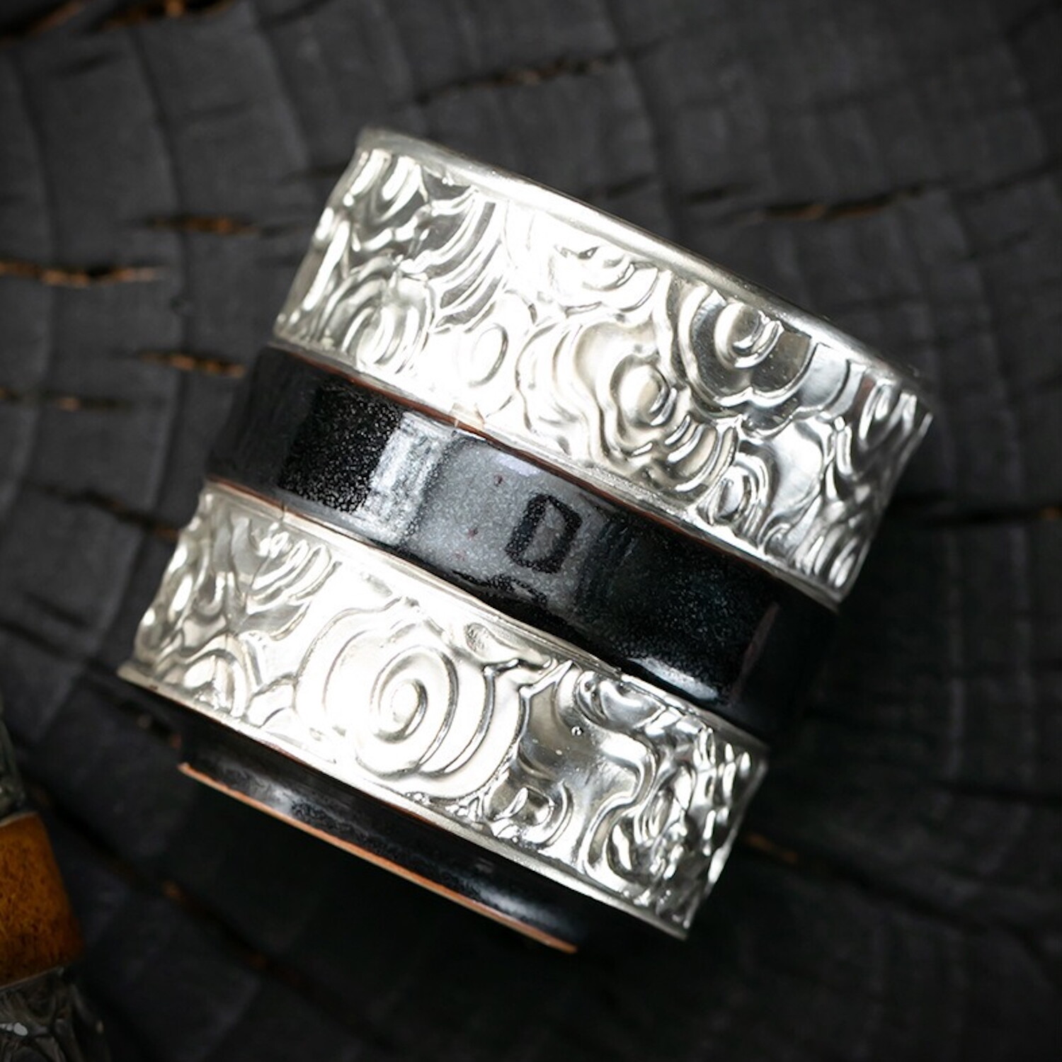 — Three-Layer Structure — Black glaze band offers a smooth grip and temperature balance, framed by cloud-textured silver bands