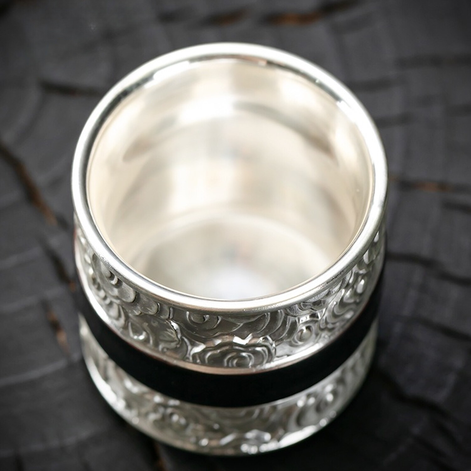 The Nocturne Silver-Lined Cup turns every sip into a ritual. Its silver interior reflects tea, sake, or whiskey with luminous clarity, making each drink glow like liquid light. The exterior layers combine embossed cloud motifs with a midnight-black glaze band, creating a striking contrast of texture and depth. Perfectly sized at 110ml, it balances elegance and function—ideal for gongfu tea, whiskey tastings, or espresso.
