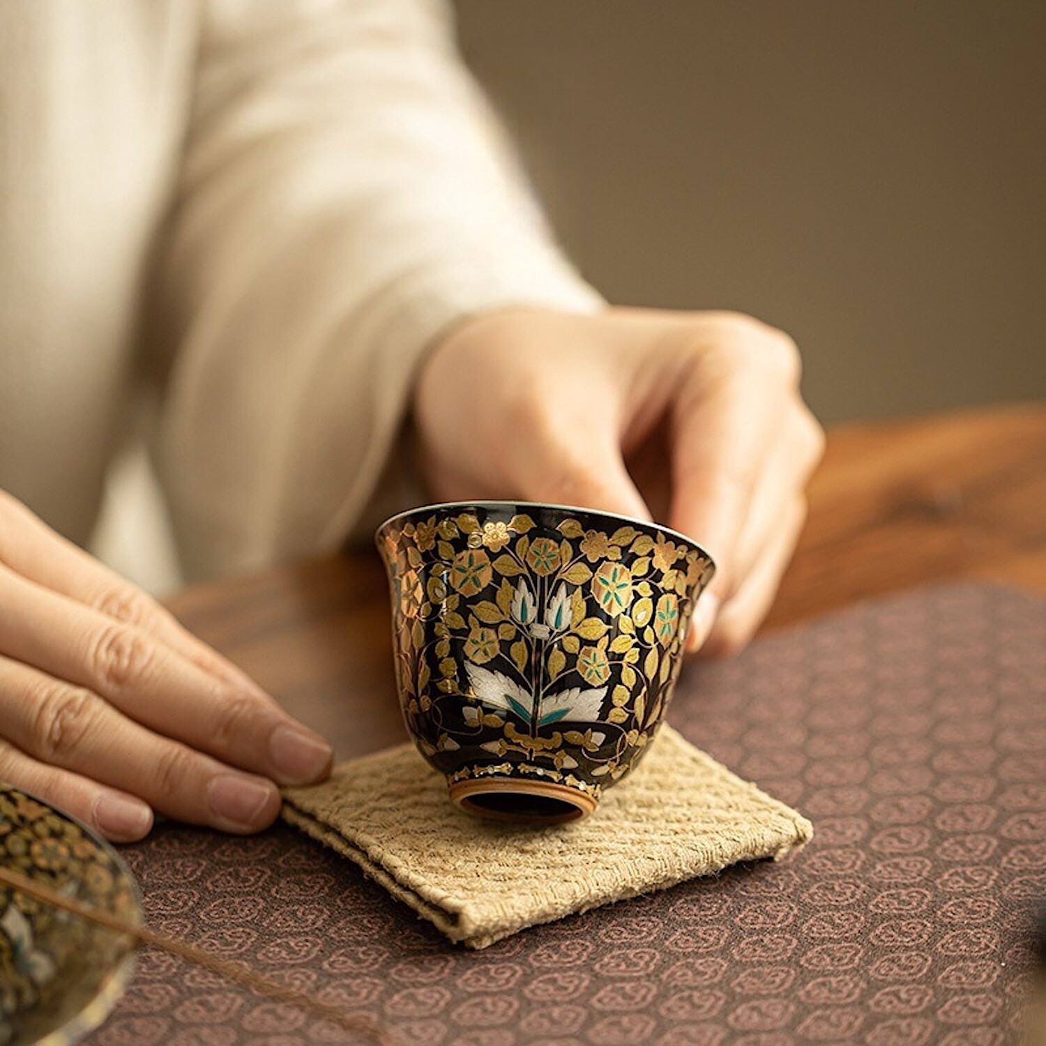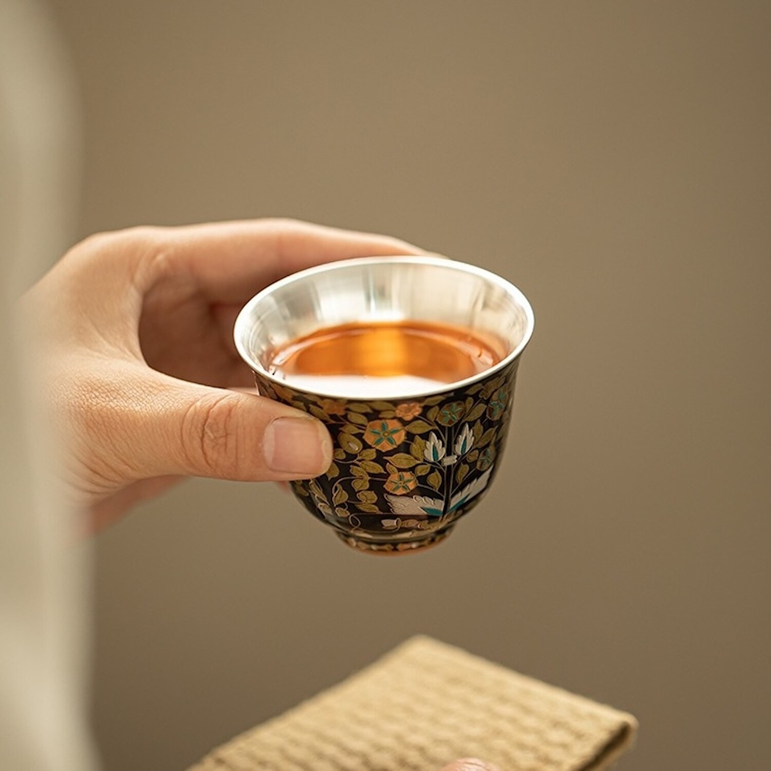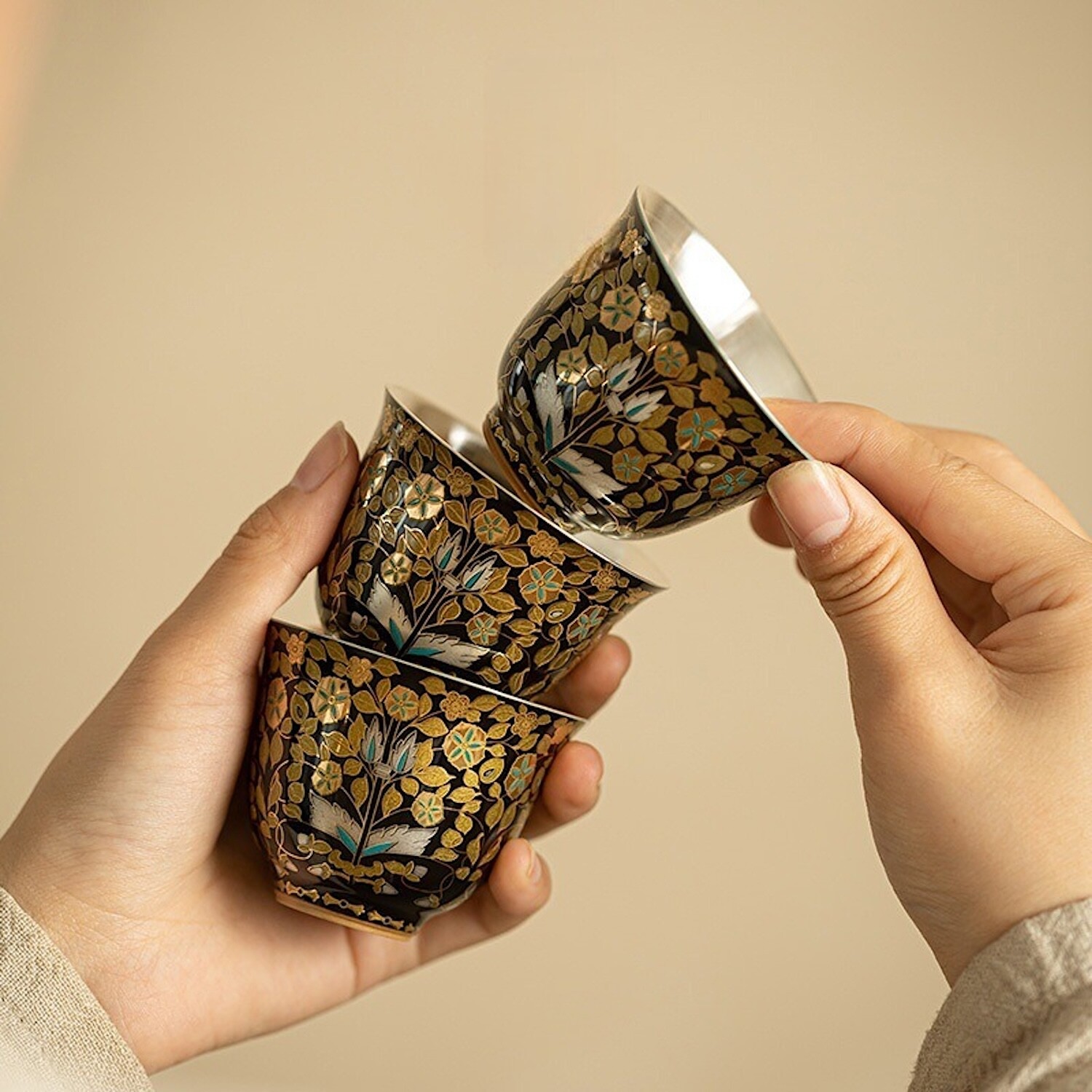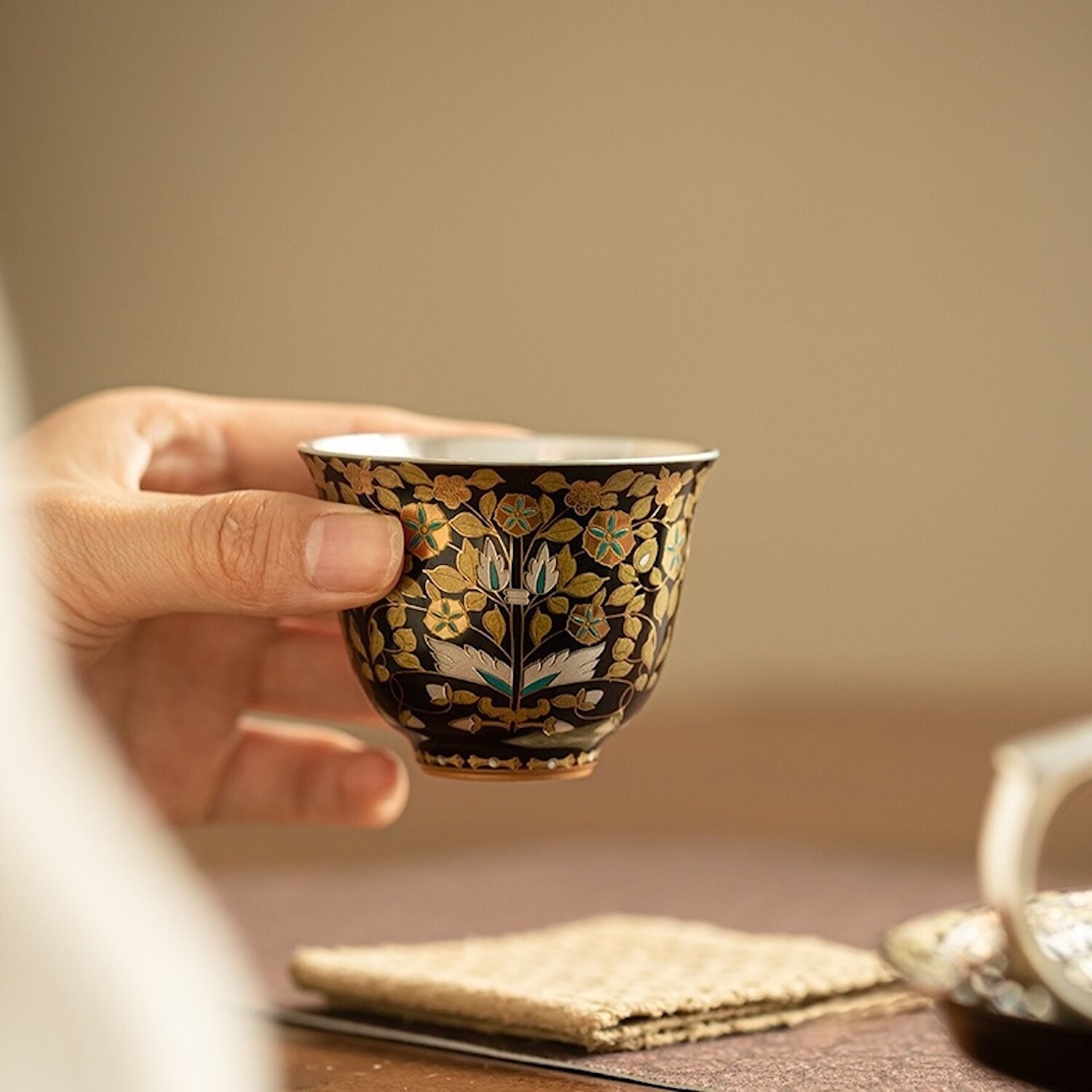 The Noir Bloom Silver-Lined Cup unites porcelain artistry with 24K gold and silver inlay. Against a midnight-black glaze, gilded vines unfurl in quiet opulence, each detail brought to life with enamel blossoms. Within, a pure silver lining reflects tea or sake with crystalline clarity, enhancing aroma while offering natural antibacterial benefits. At 70 ml, the form is perfectly balanced—wide enough to release fragrance, compact enough for mindful sipping.