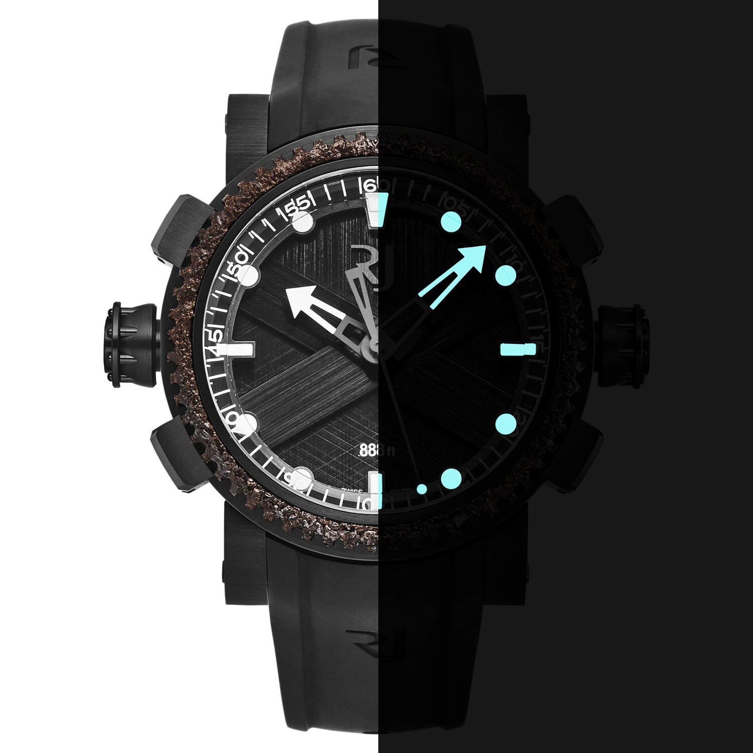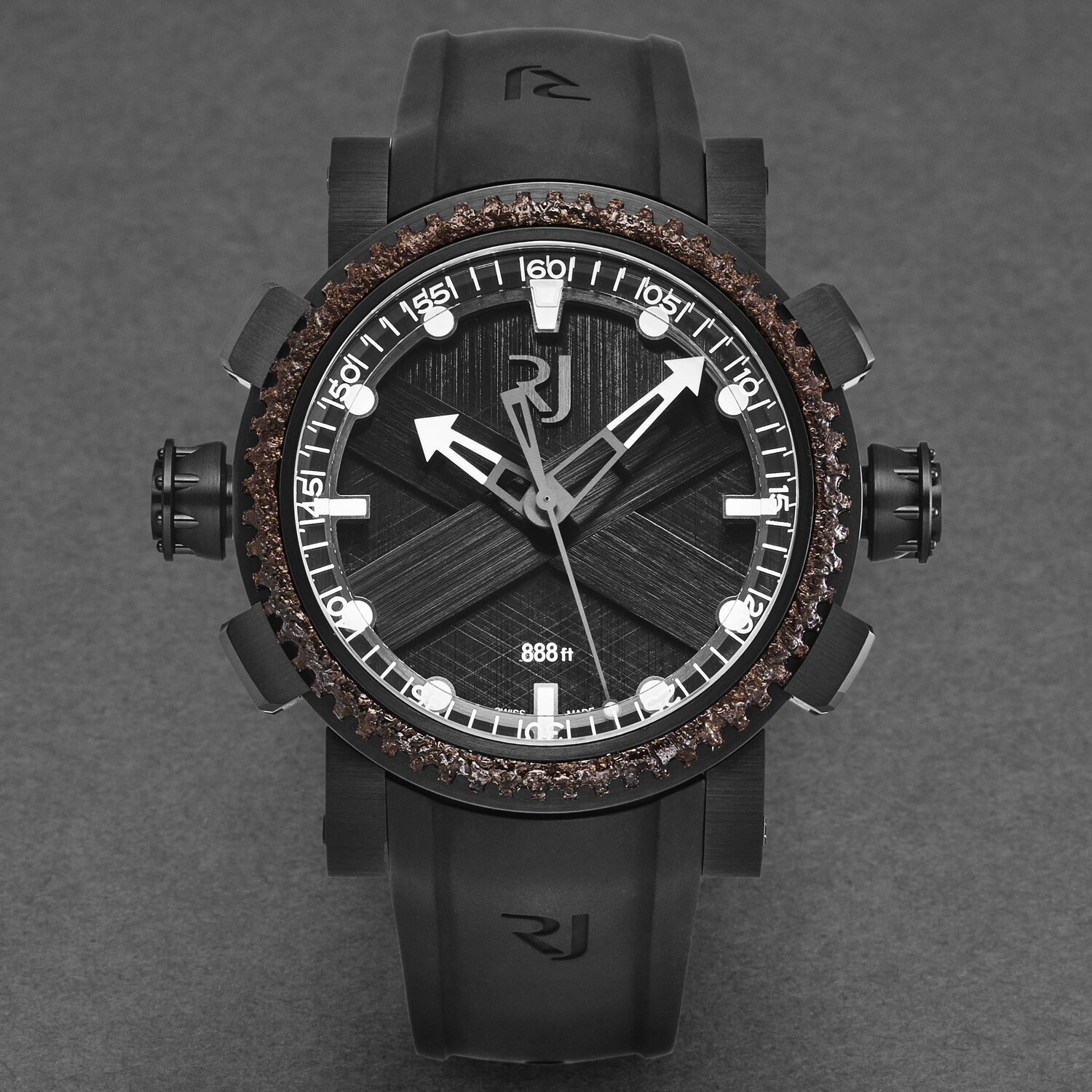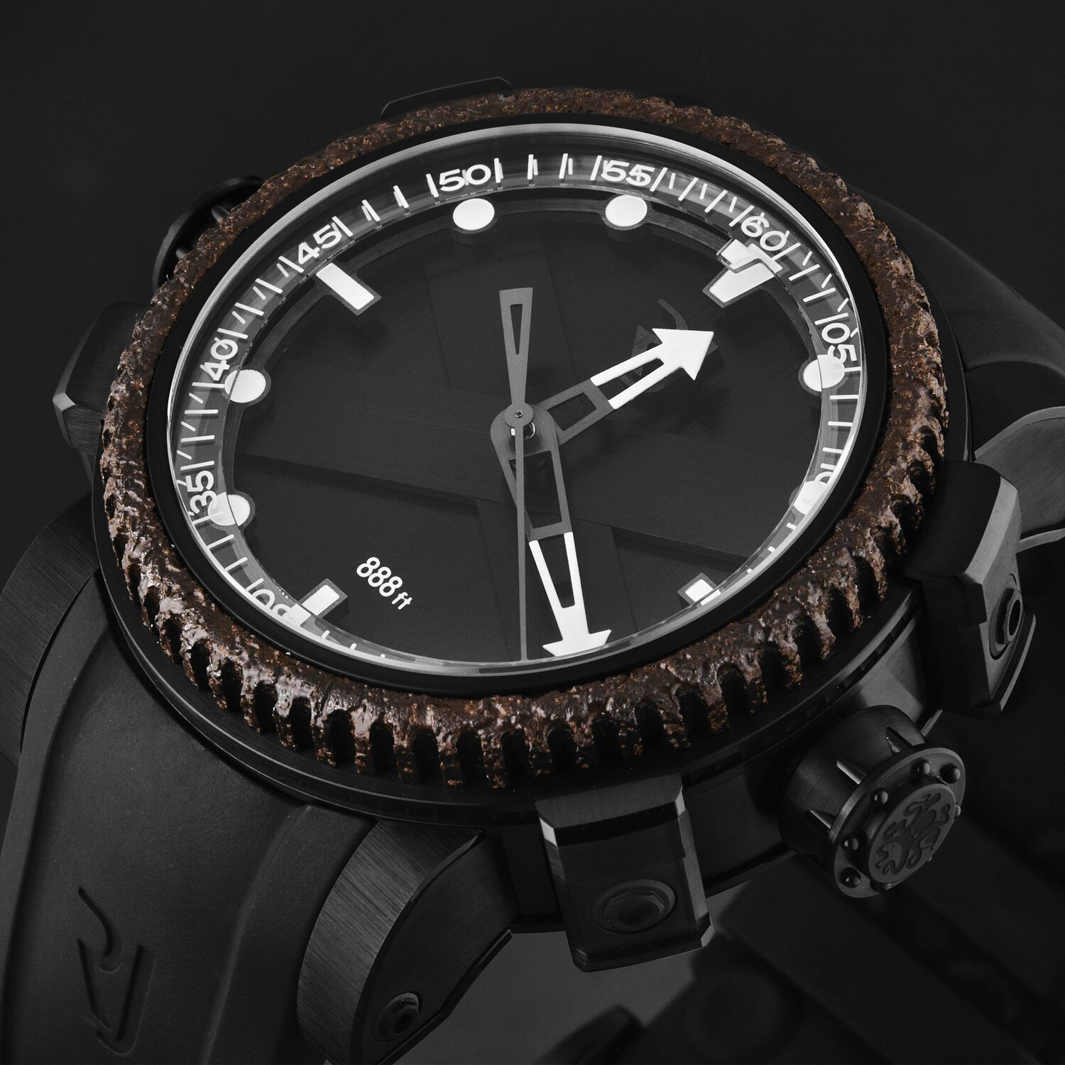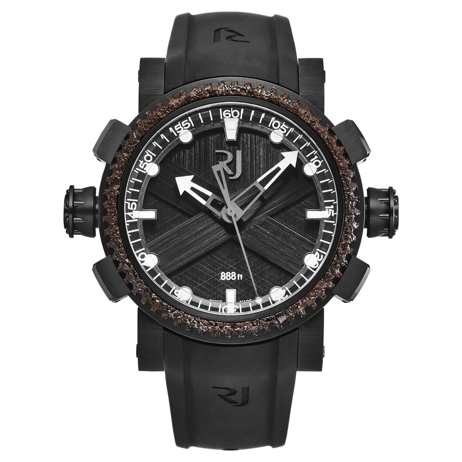 The RJ Titanic-DNA Octopus diver is a timepiece born from history and daring. Its bezel is crafted from stabilized rusted steel salvaged from the Titanic, paired with a 46 mm black PVD case. The ebony dial has a cold, midnight presence, while blue Super-LumiNova glows like deep-sea bioluminescence. Powered by a self-winding movement, it is water resistant to 270 m and limited to 888 pieces.