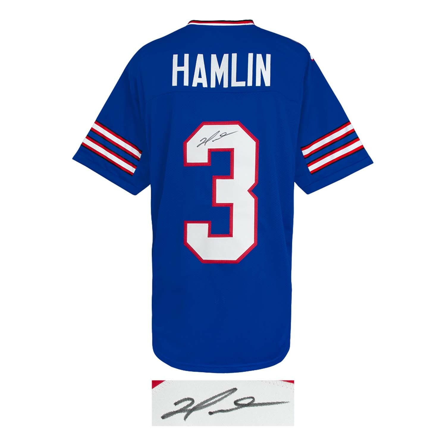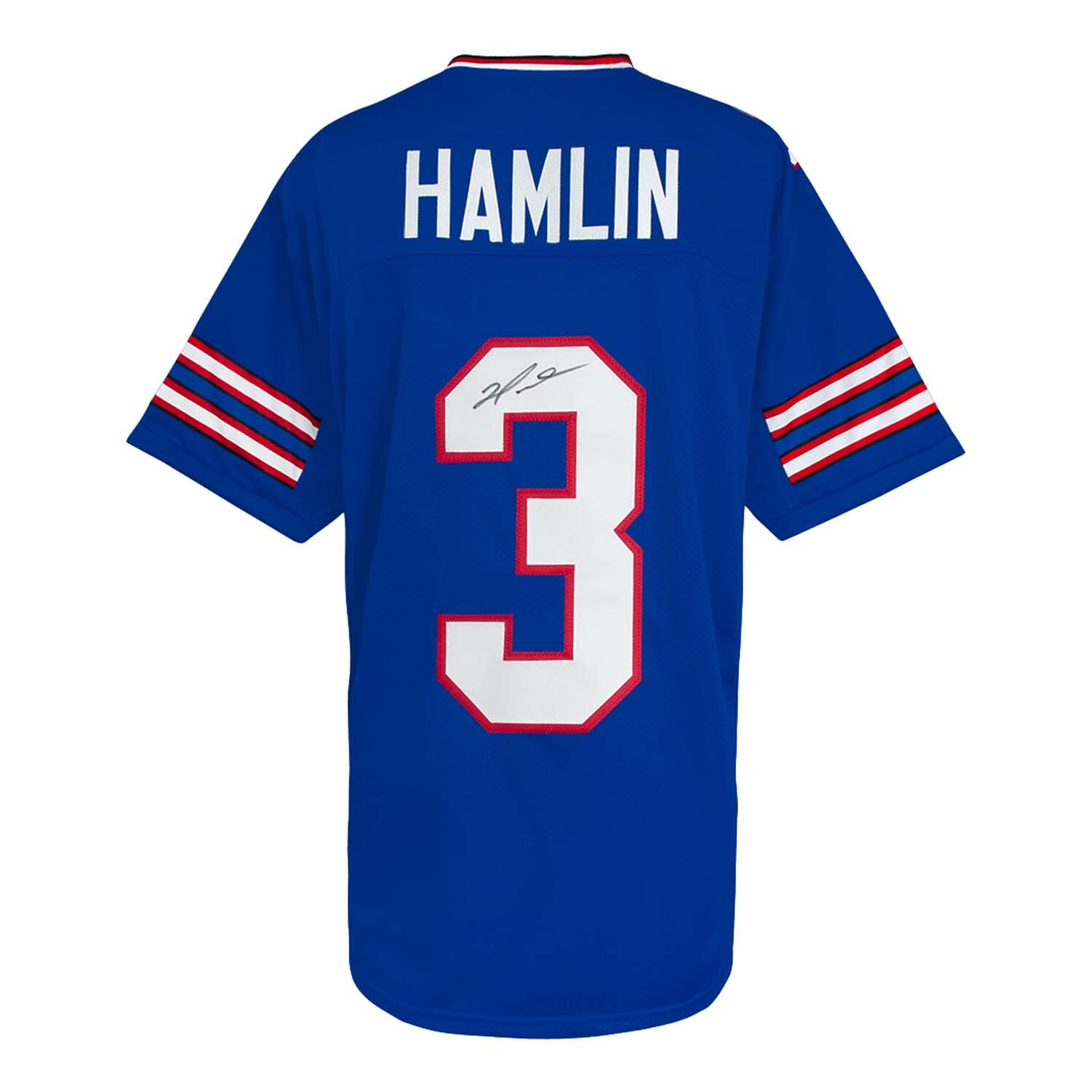 Damar Hamlin signed blue custom football jersey. Item comes with a Schwartz Sports Memorabilia tamper-proof numbered hologram and Certificate of Authenticity which can be verified online. Jersey is size XL.