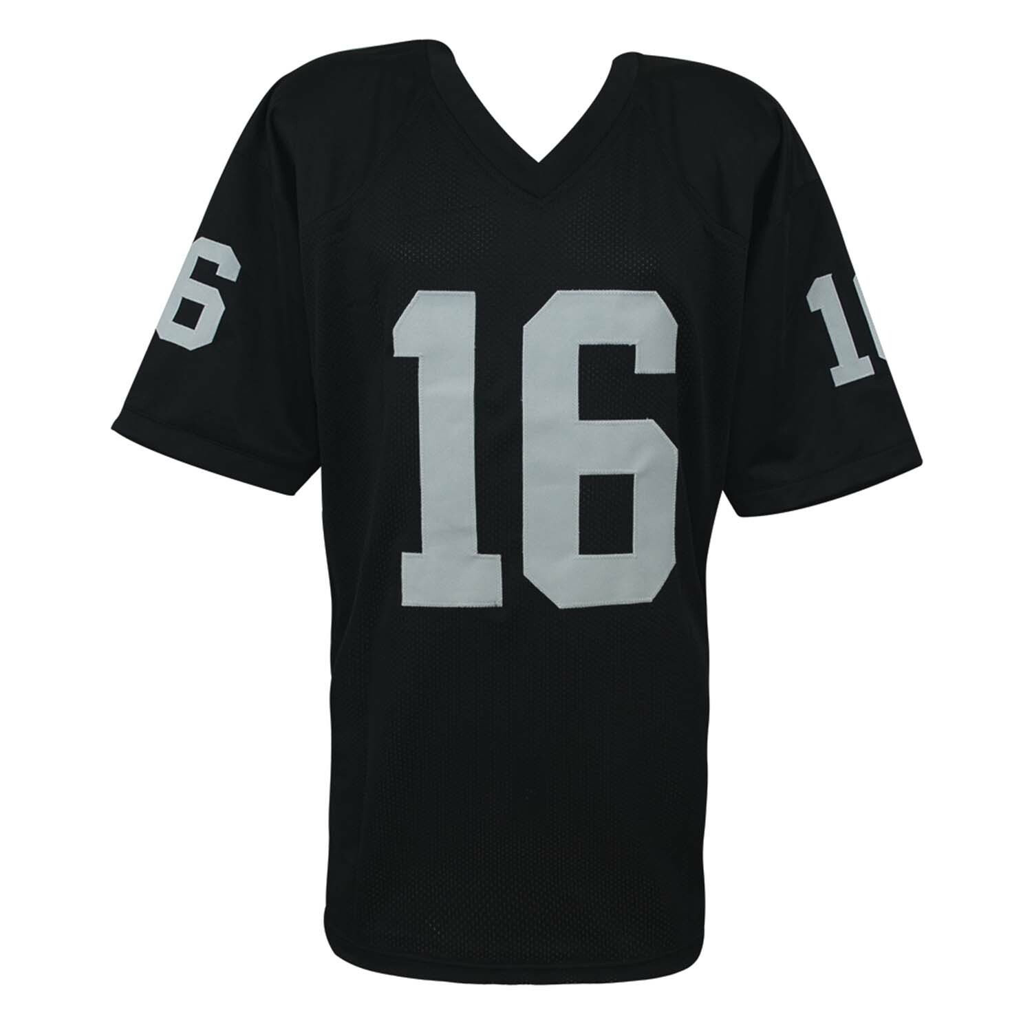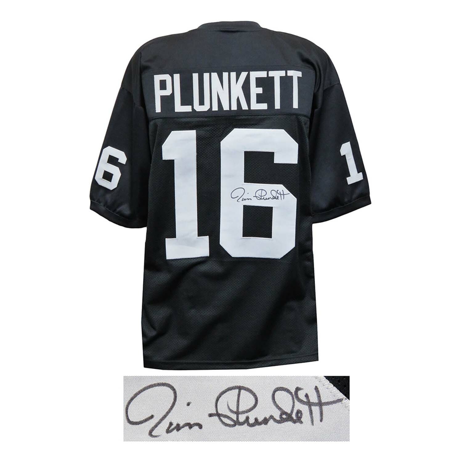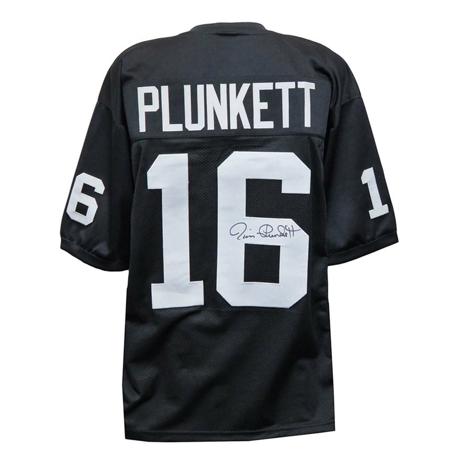 Jim Plunkett signed black custom football jersey. Item comes with a Schwartz Sports Memorabilia tamper-proof numbered hologram and Certificate of Authenticity which can be verified online. Jersey is size XL.