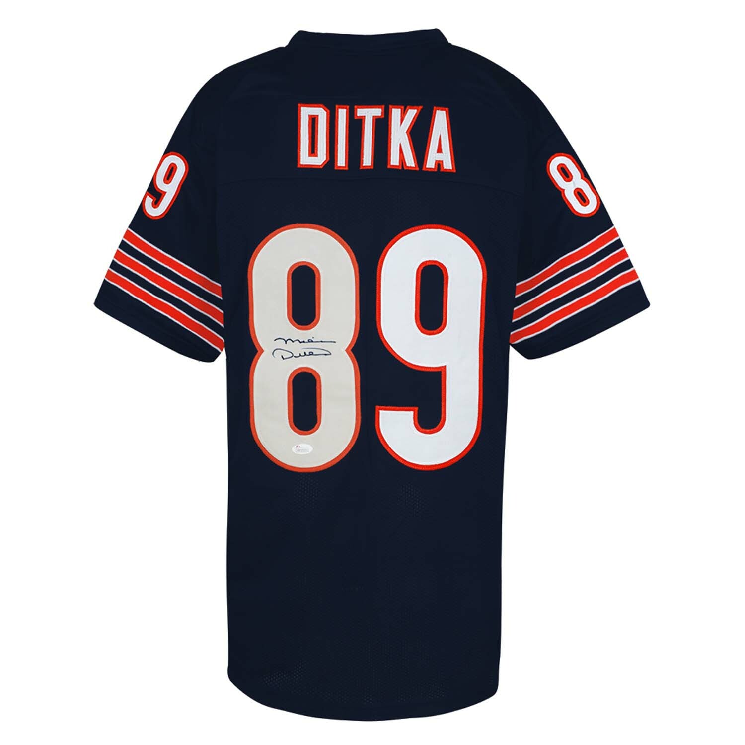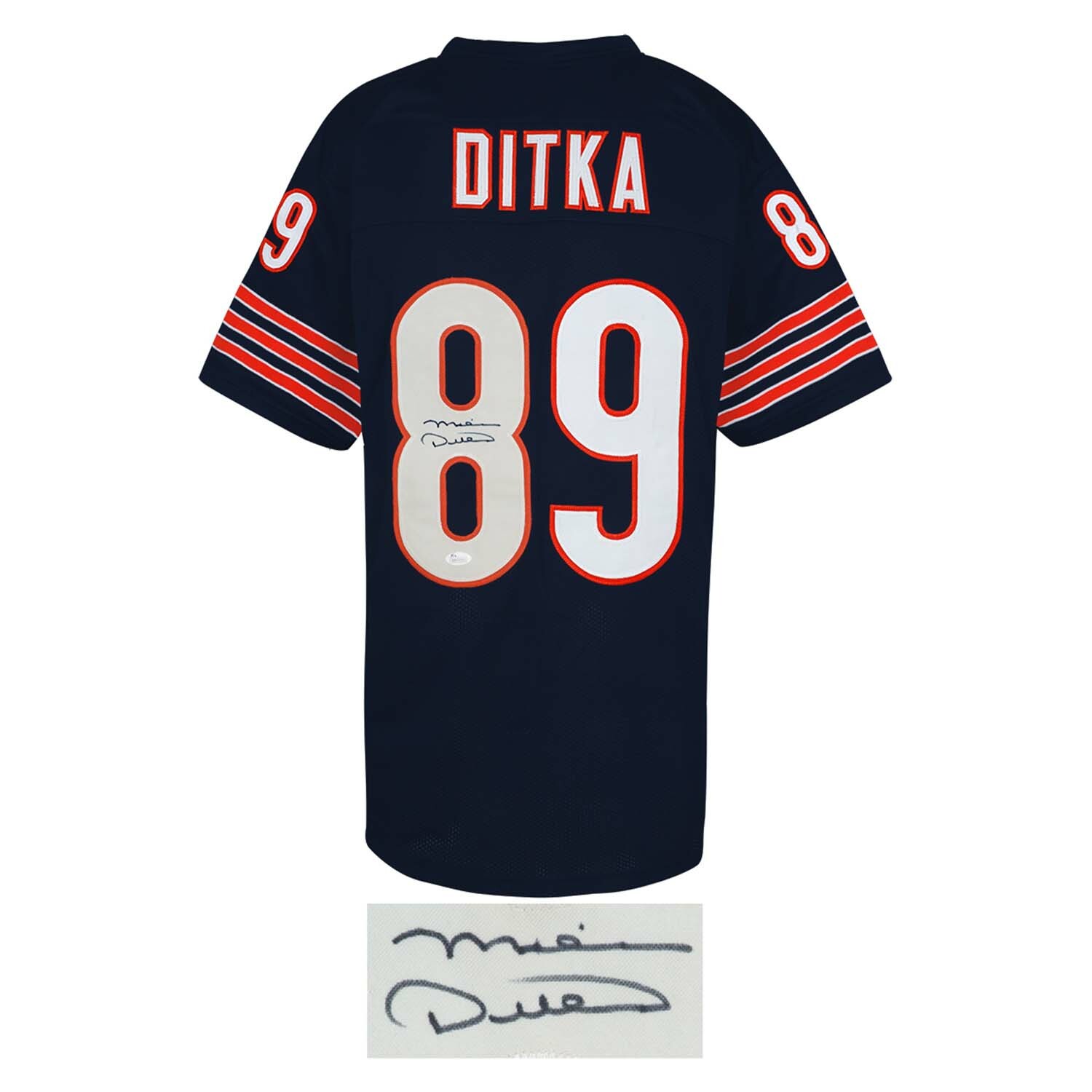 Mike Ditka signed navy custom football jersey. Item comes with a JSA (James Spence Authentication) tamper evident numbered sticker and matching Certificate of Authenticity which can be verified online. Jersey is size XL.