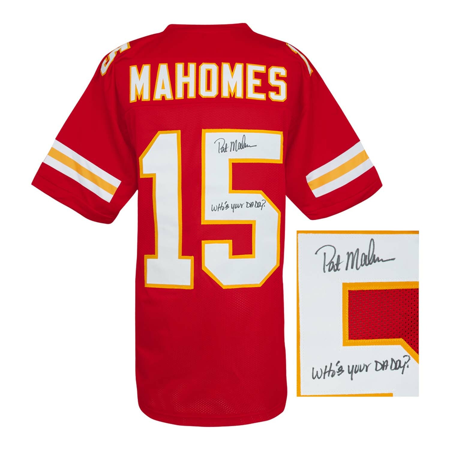Pat Mahomes Sr. signed red custom football jersey with 'Who's Your Daddy?' inscription. Item comes with a Schwartz Sports Memorabilia tamper-proof numbered hologram and Certificate of Authenticity which can be verified online. Jersey is size XL.