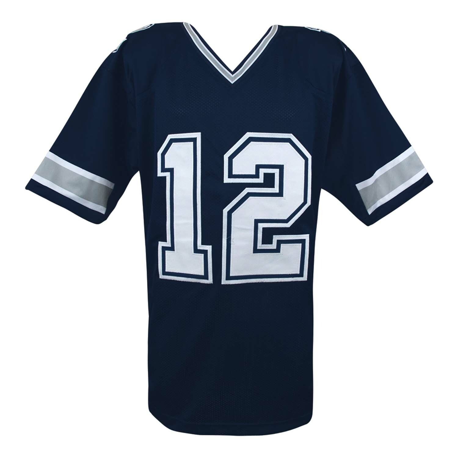 Roger Staubach signed navy custom football jersey. Item comes with a Schwartz Sports Memorabilia tamper-proof numbered hologram and Certificate of Authenticity which can be verified online. Jersey is size XL.
