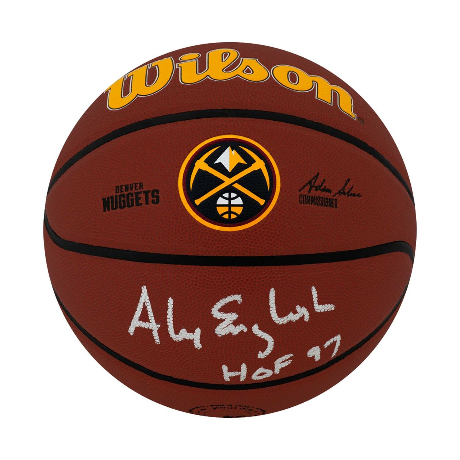 Alex English signed Denver Nuggets logo Wilson Alliance NBA basketball with 'HOF 97' inscription. Item comes with a Schwartz Sports Memorabilia tamper-proof numbered hologram and Certificate of Authenticity which can be verified online.