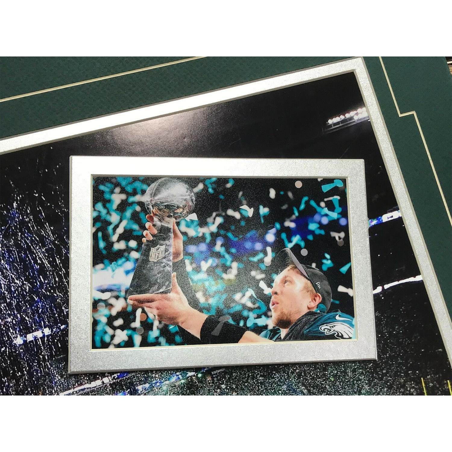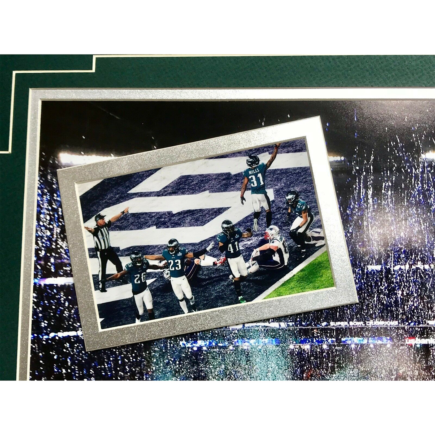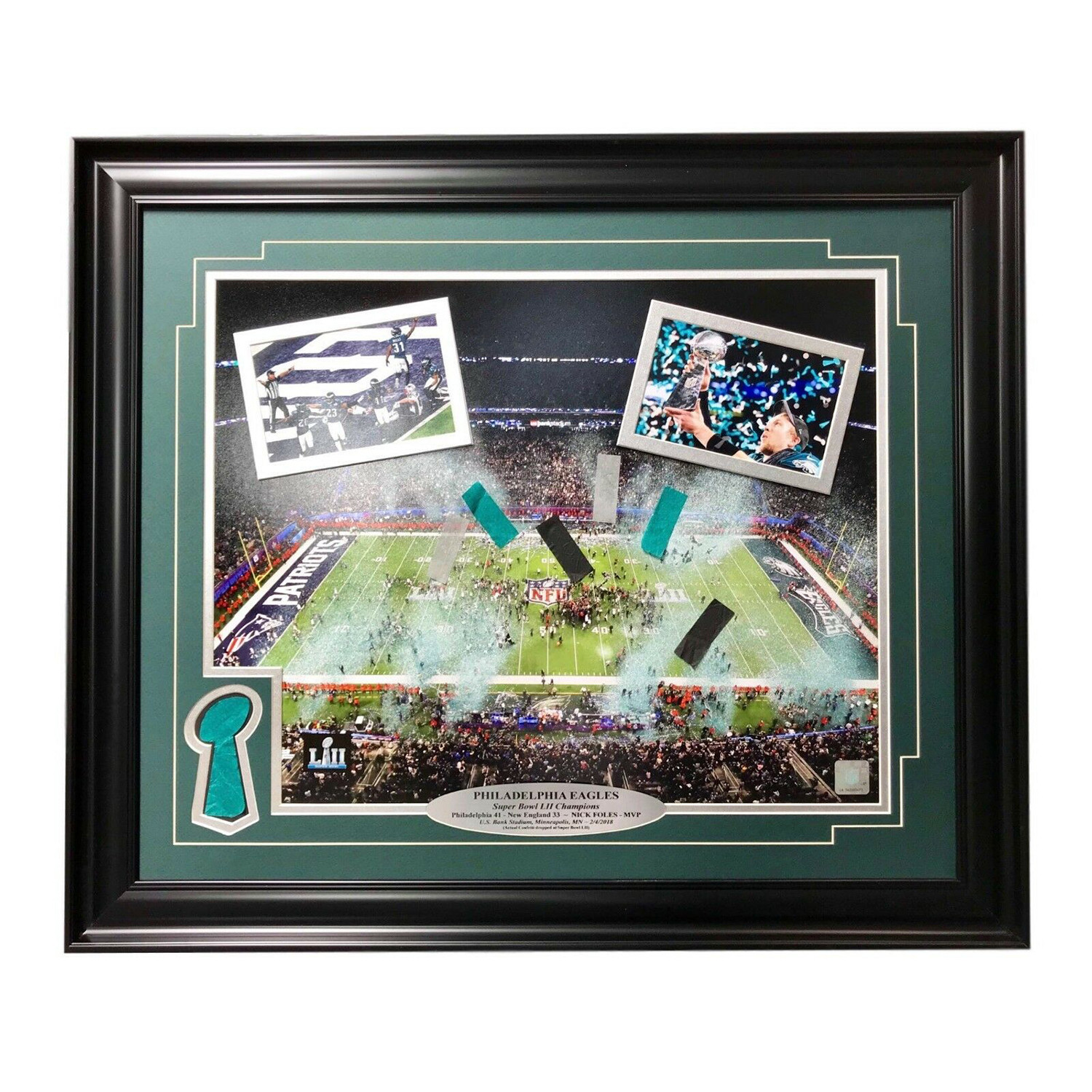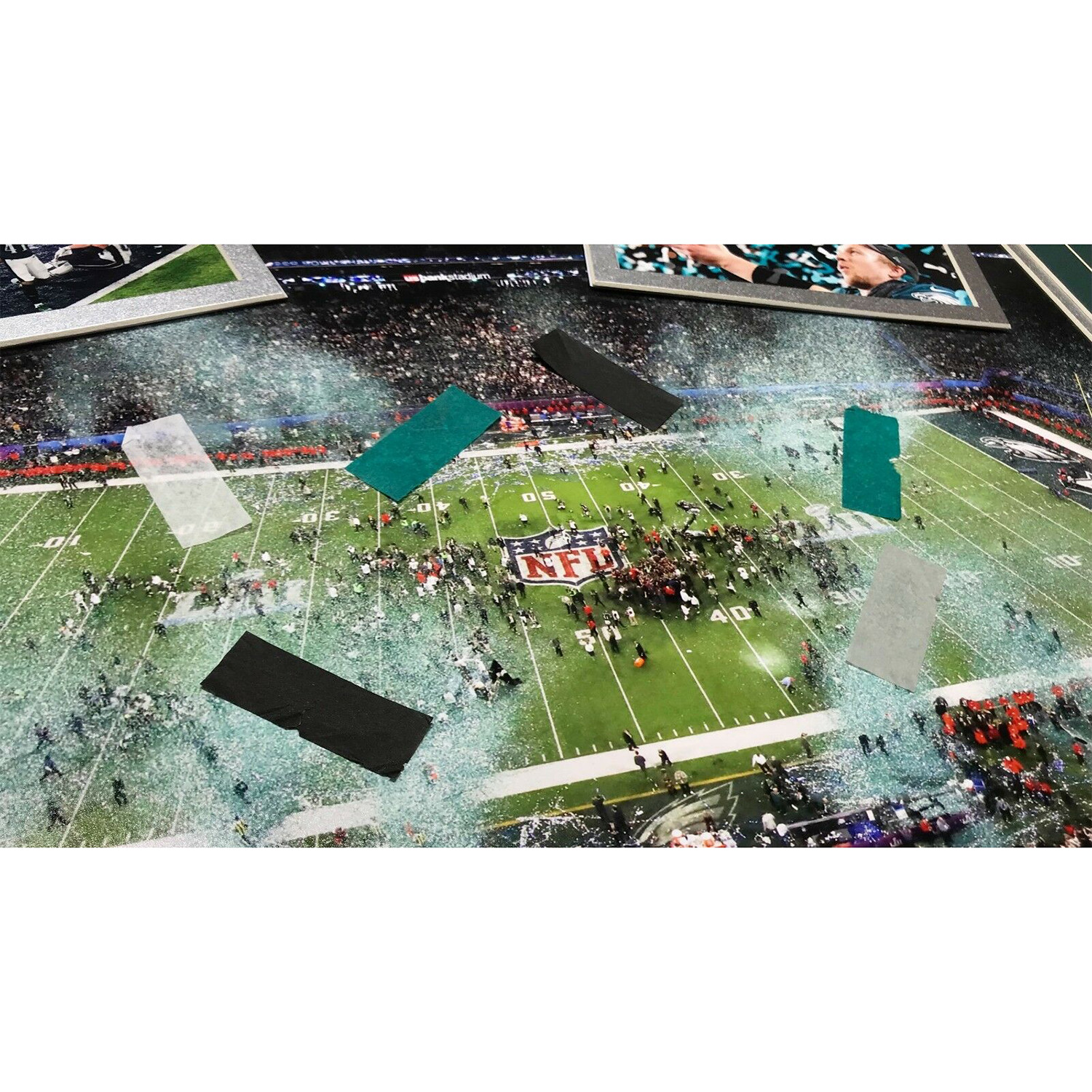This limited edition piece features a silhouette of the Lombardi trophy at the bottom left-hand corner filled with an actual Lombardi shaped confetti piece and boxed confetti pieces. At the top left-hand corner is the photo from the last play of the game where the referee signaled the football was incomplete from a Tom Brady Hail Mary. At the top right is a photo of Super Bowl MVP Nick Foles hoisting the Lombardi trophy. The actual background photo shows the celebration right after the Eagles claimed victory in the big game.
