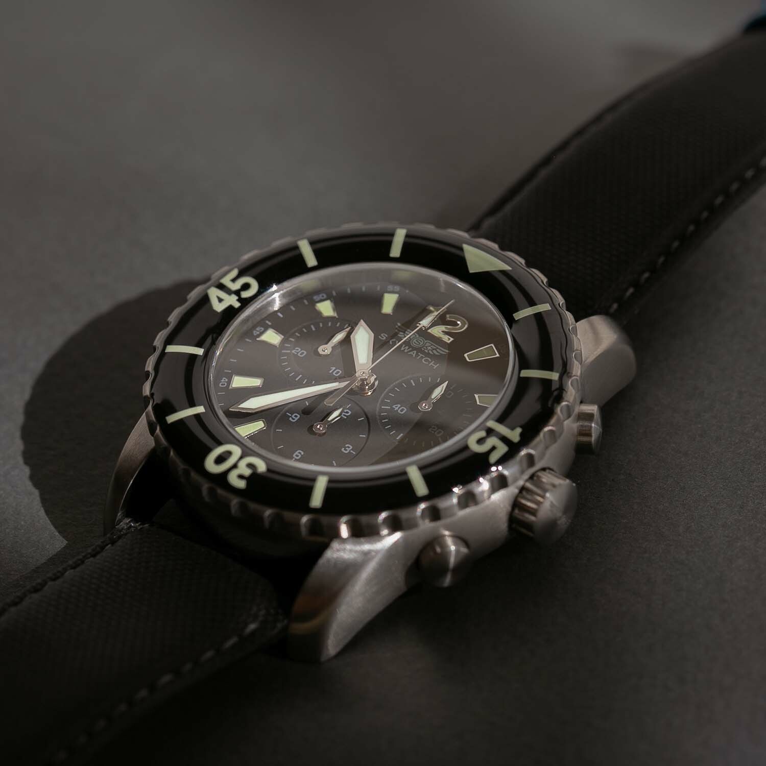 Swiss made 44mm premium-grade brushed stainless steel chronograph diver's watch with a Ronda 5030.D caliber movement, 20ATM water-resitant down to 200 meters, scratch-resistant sapphire crystal, Super-LumiNova photo luminescent hands, dial and bezel markers, uni-drectional rotating hand-crafted bezel coated in enamel, screw-down crown and premium Italian sailcloth strap lined in nubuck leather. Two-year warranty.