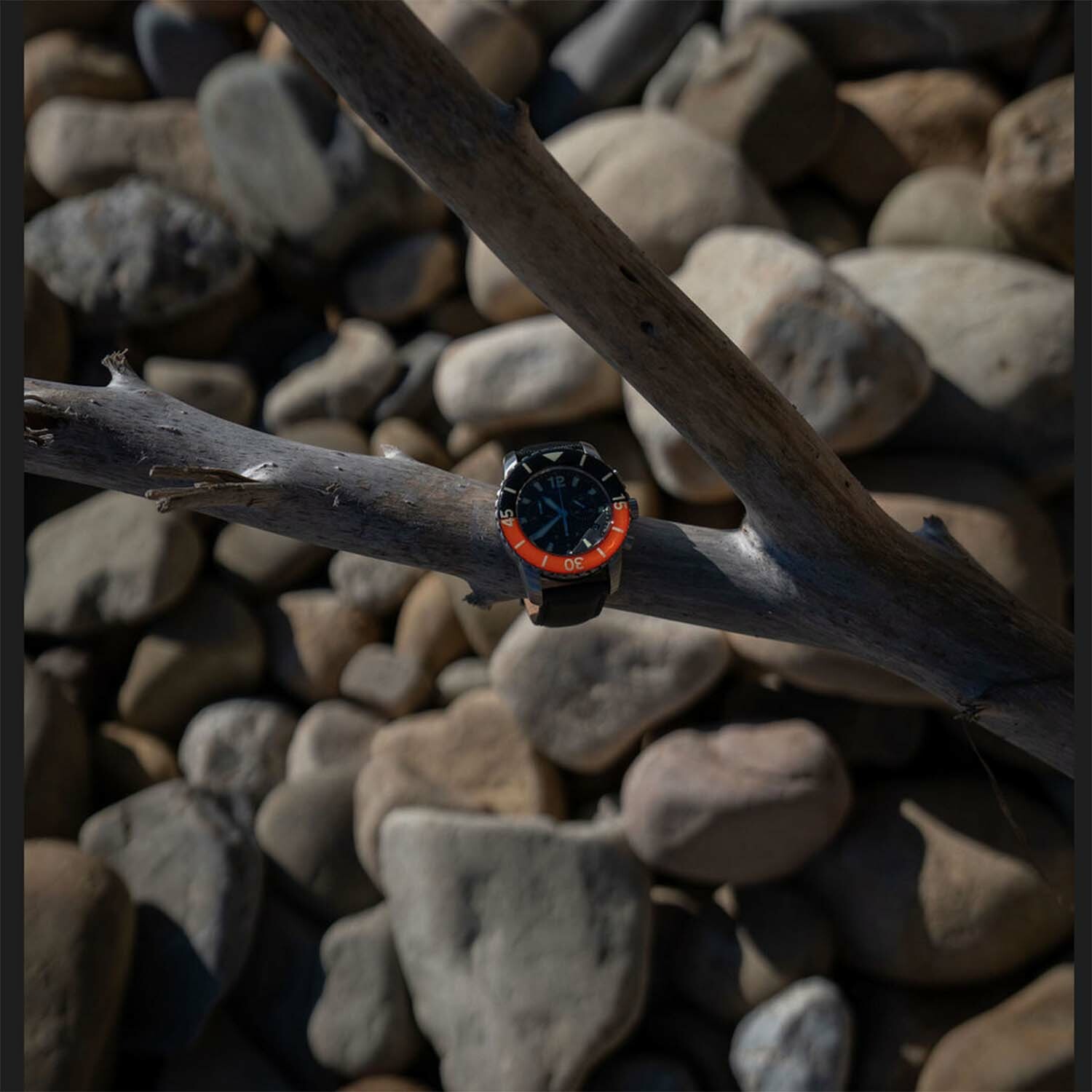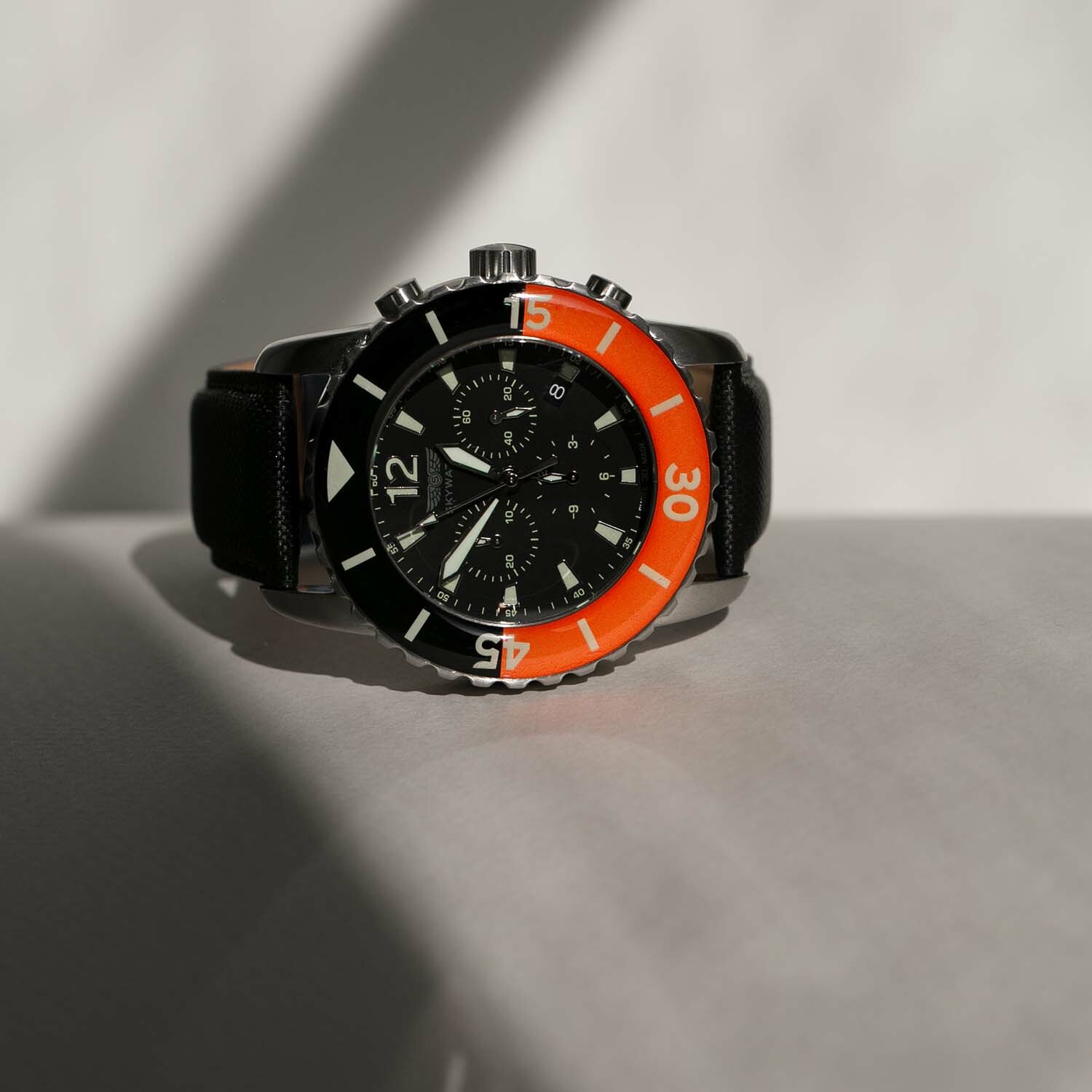 Swiss made 44mm premium-grade brushed stainless steel chronograph diver's watch with a Ronda 5030.D caliber movement, 20ATM water-resitant down to 200 meters, scratch-resistant sapphire crystal, Super-LumiNova photo luminescent hands, dial and bezel markers, uni-drectional rotating hand-crafted bezel coated in enamel, screw-down crown and premium Italian sailcloth strap lined in nubuck leather. Two-year warranty.