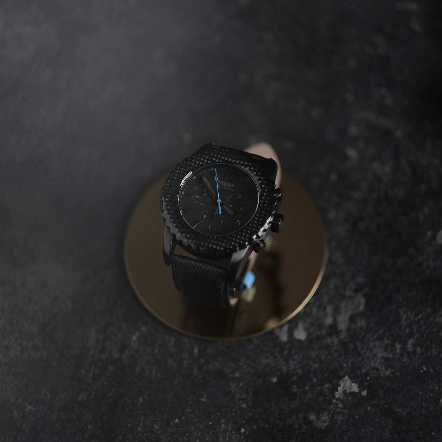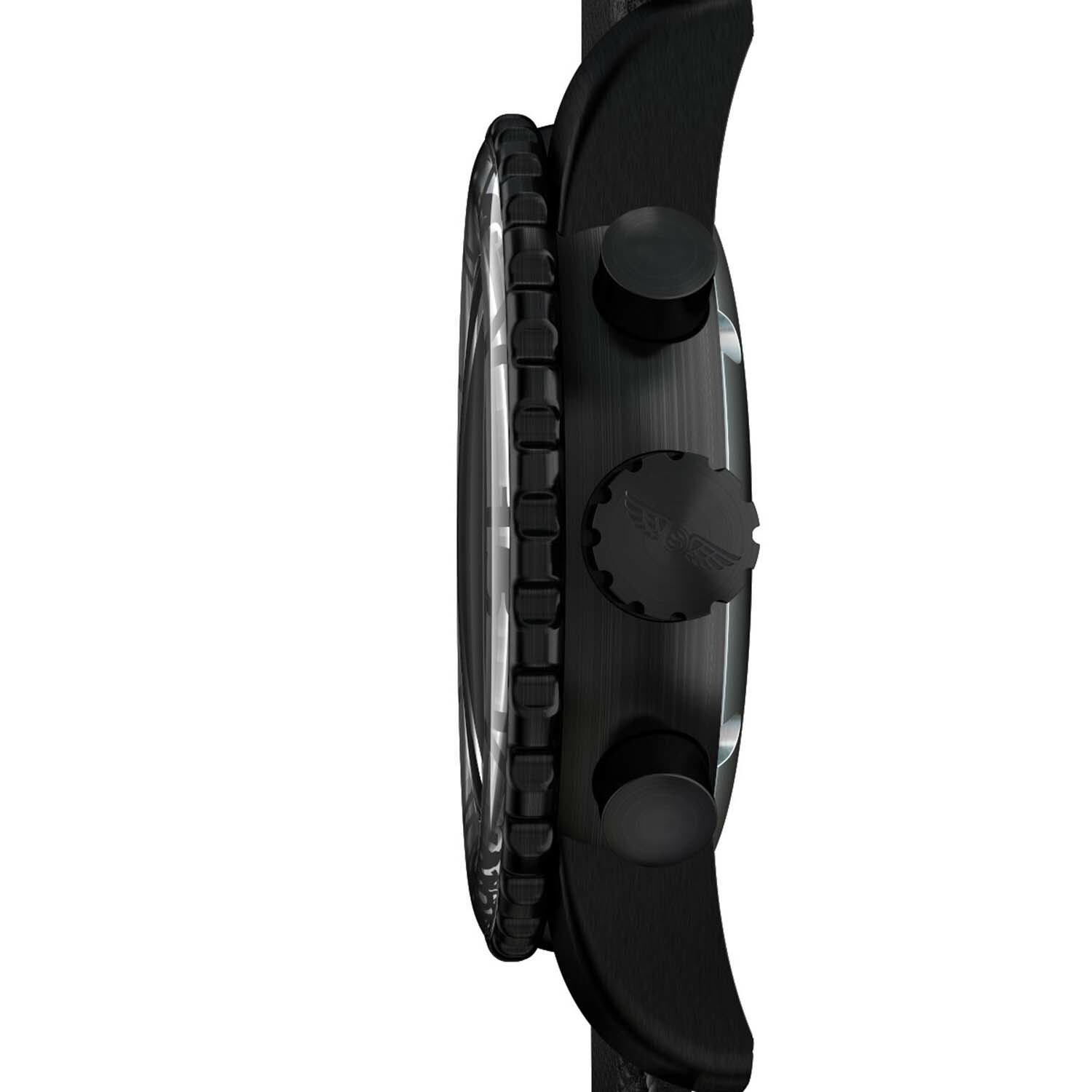 Swiss made 44mm premium-grade black PVD coated brushed stainless steel chronograph diver's's watch with a Ronda 5030.D caliber movement, 20ATM water-resitant down to 200 meters, scratch-resistant sapphire crystal, Super-LumiNova photo luminescent hands, dial and bezel markers, uni-drectional rotating hand-crafted bezel with carbon fiber coated in enamel, screw-down crown and premium Italian sailcloth strap lined in nubuck leather. Two-year warranty.