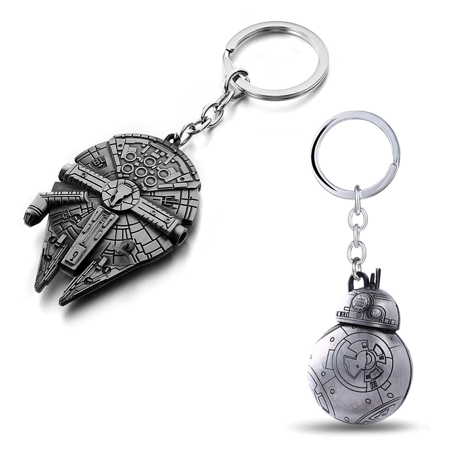 Express your love for Star Wars with these novelty keychains! Each one features a highly detailed design of your favorite Star Wars Character or Spacecraft. This 2-pack includes a BB8 silver figure & the Millennium Falcon.