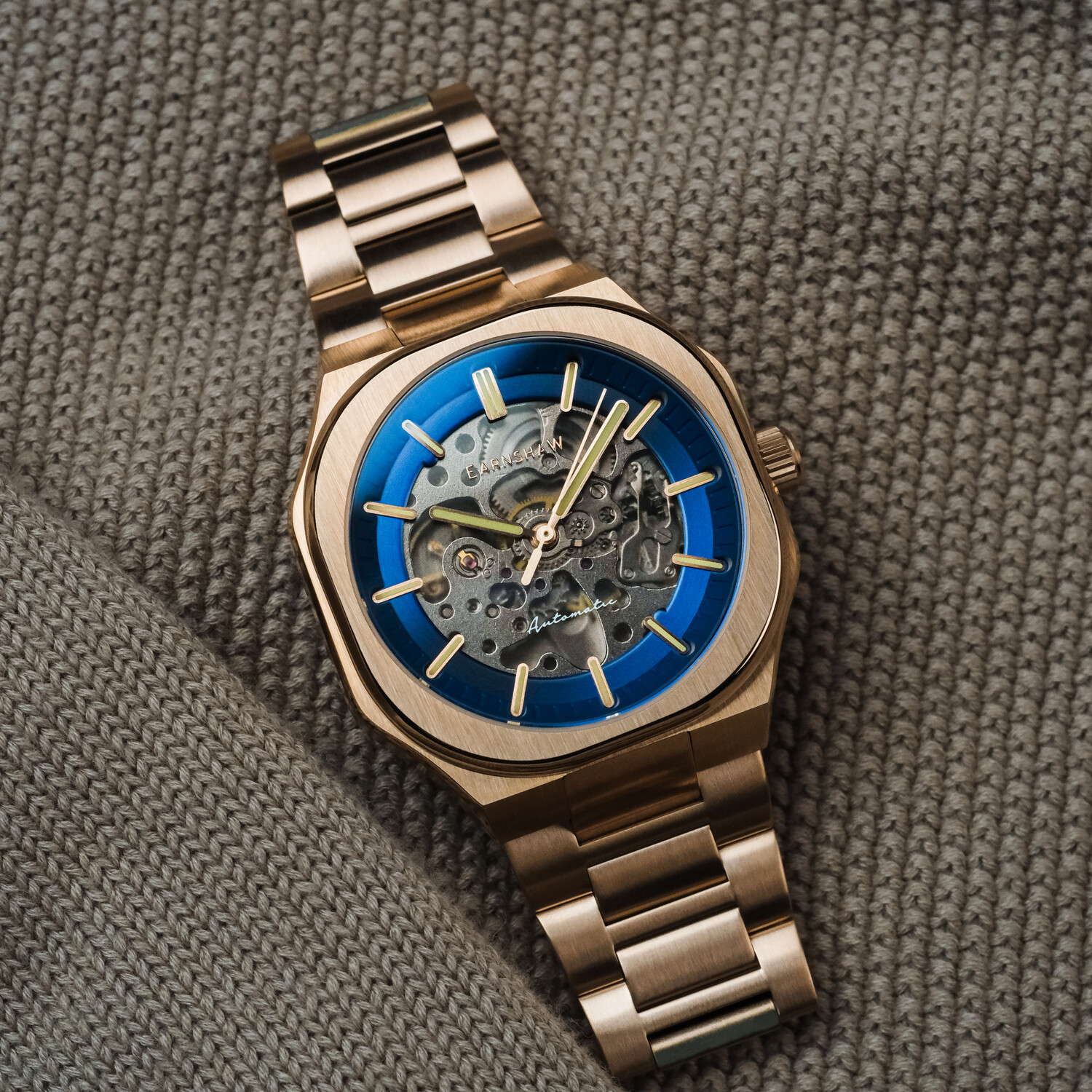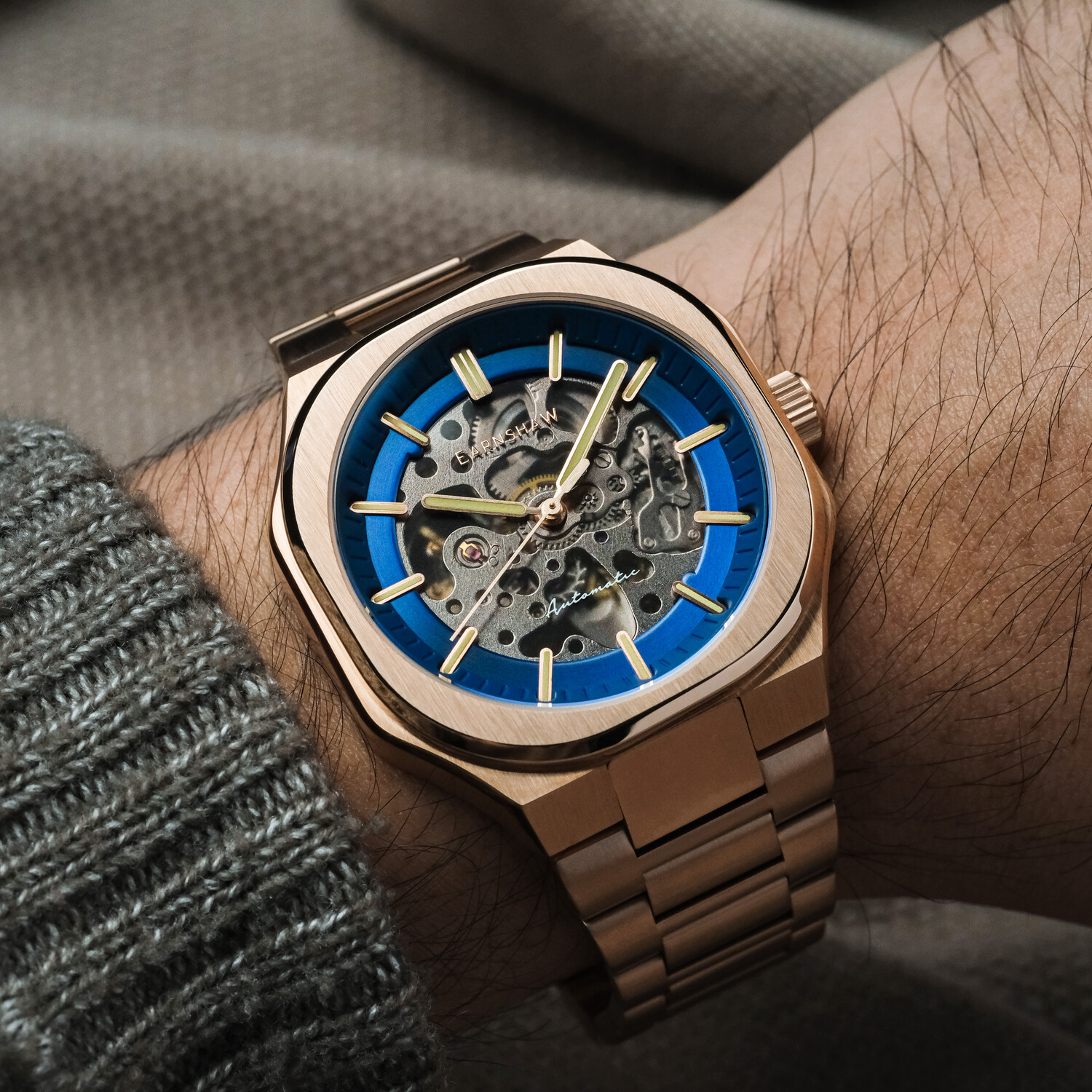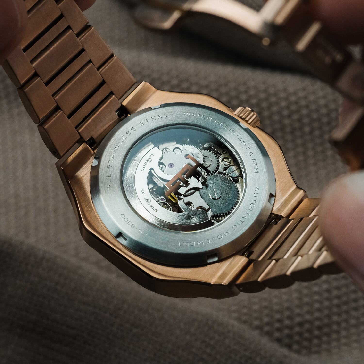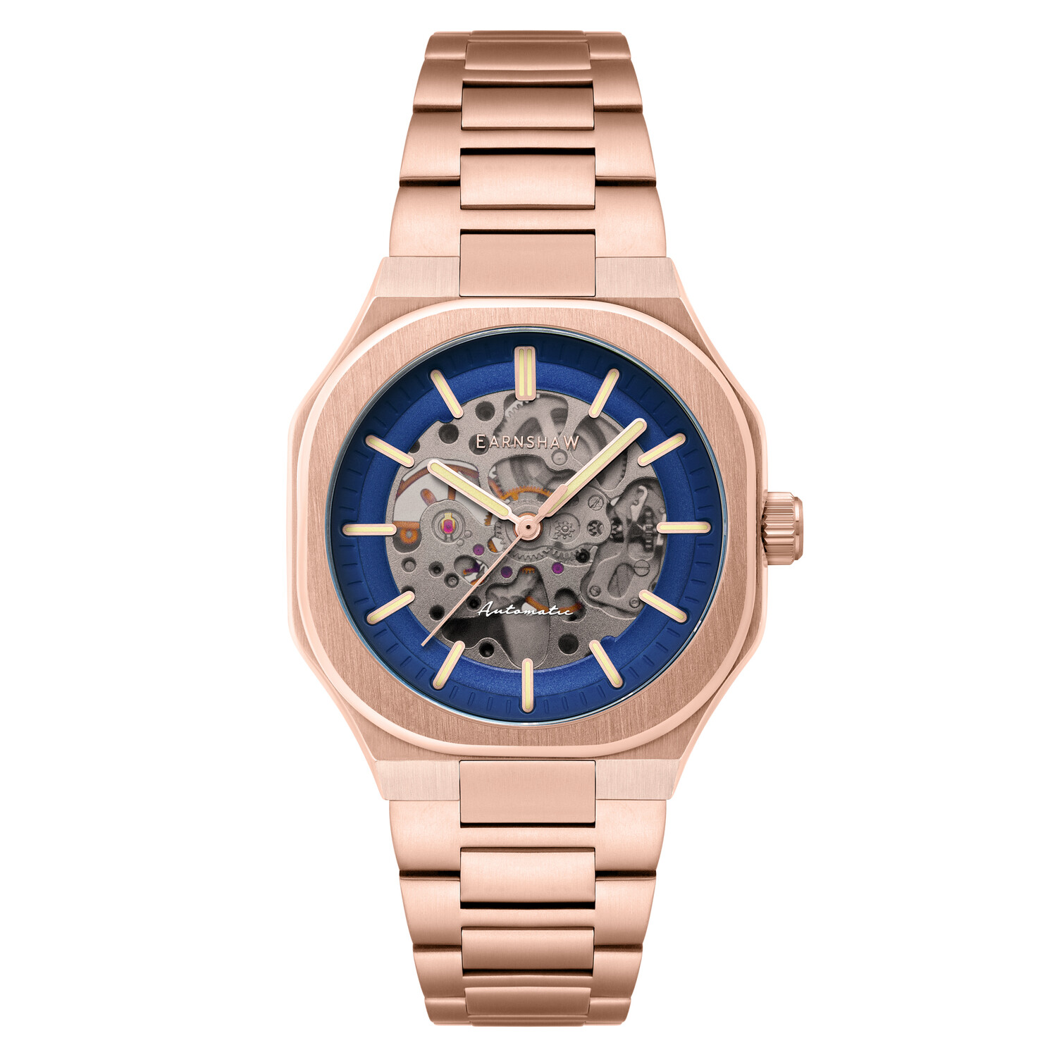 COLLECTION: EXETER MODEL: ES-8300-66 MOVEMENT: AUTOMATIC CASE MATERIAL: STAINLESS STEEL CASE DIAMETER (MM): 42 CASE THICKNESS (MM): 13 CASE SHAPE: ROUND CASE COLOR: ROSE GOLD DIAL COLOR: BLUE BAND: STAINLESS STEEL BAND COLOR: ROSE GOLD BUCKLE: DEPLOYMENT BUCKLE WITH PUSH BUTTONS BAND WIDTH (MM): 25 WATER RESISTANCE: 5 ATM WATCH WEIGHT (G): 150 WARRANTY: 2 YEARS