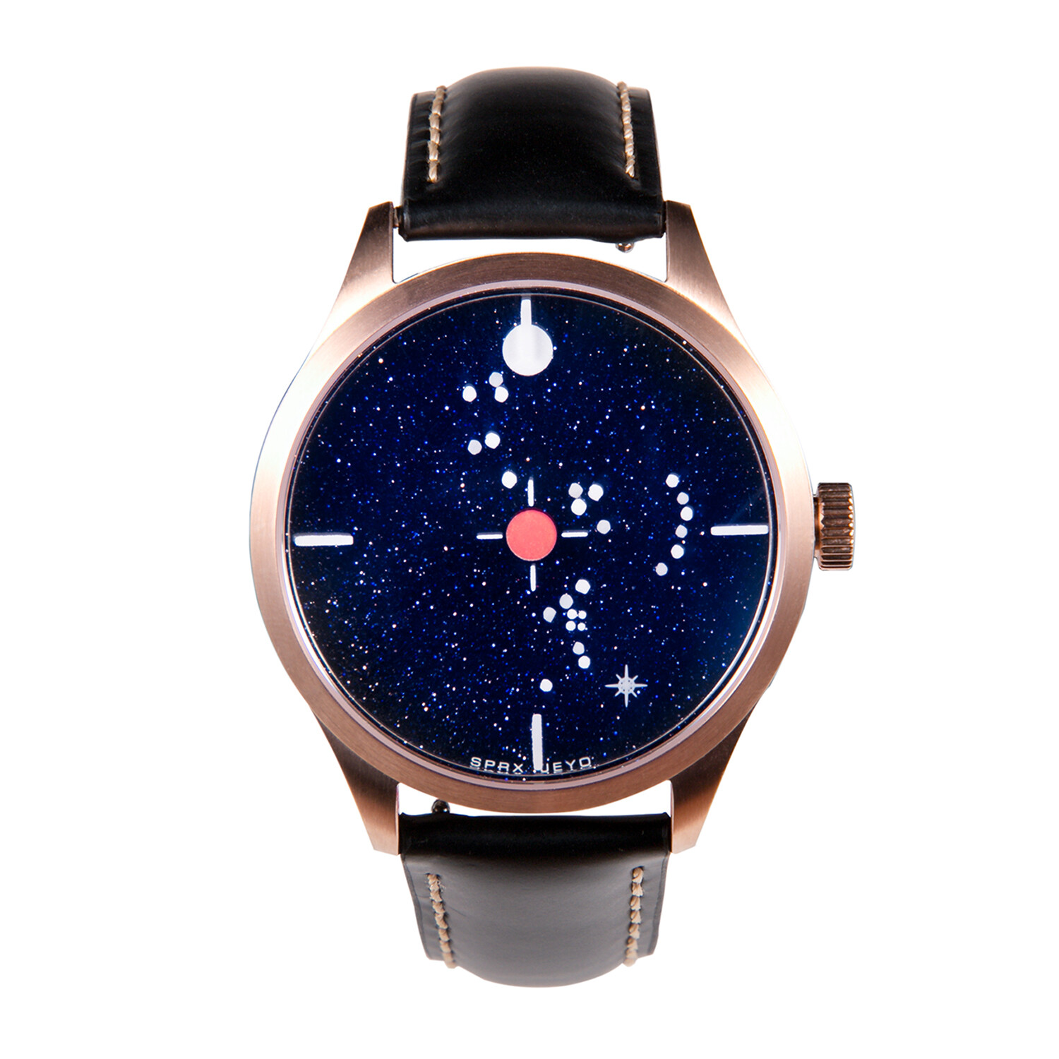 The dial features white luminous dots reminiscent of stars in the galaxy. The hour marker is denoted by the second largest star closer to the edge of the dial while the minute marker is denoted by the largest star closest to the edge. When the hour and minute markers meet, the hour marker is eclipsed by the minute marker, and all the stars plus the center orange star line up to form the famous constellation, the Orion. The luminous stars set against the backdrop of the beautiful aventurine dial for an intriguing and breathtaking timepiece.