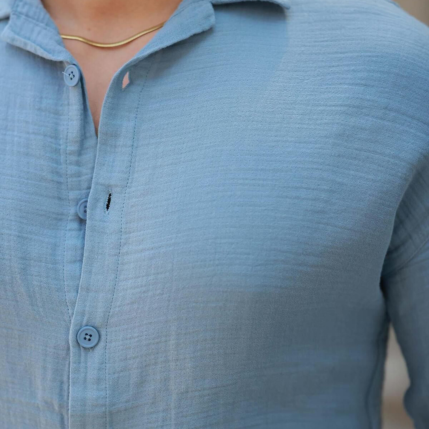 Oversized Textured Long-Sleeve Button-Up Shirt // Cold Blue