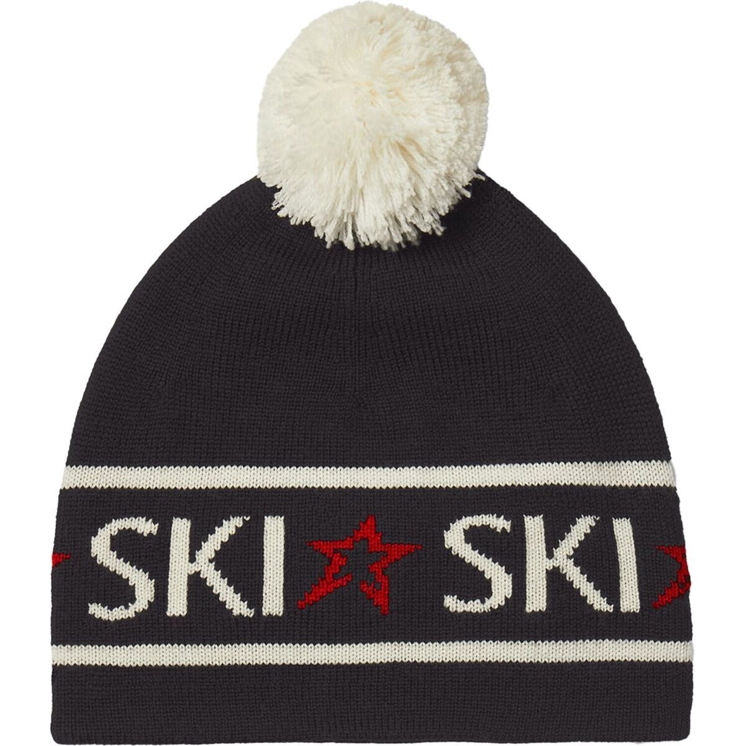 Cozy beanie made with merino wool Merino wool is not scratchy, but soft against the skin Ski slogan plus pom on top for some playfulness