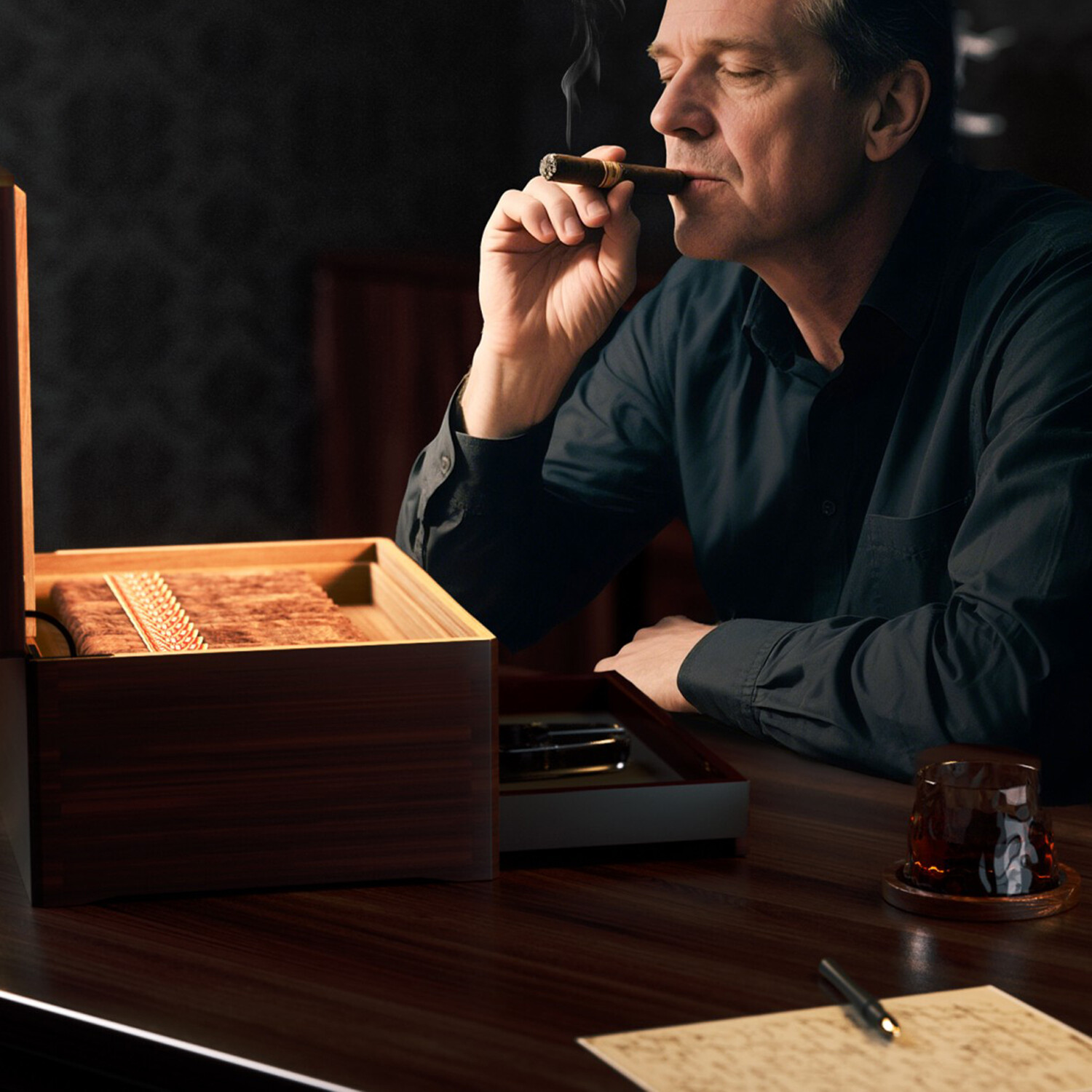 The Enstatite Cigar Humidor is crafted for serious collectors, featuring a two-tiered design that maximizes storage and an extra storage drawer for cigar accessory storage. Inside, a hand-finished Spanish cedar tray and divider promote ideal humidity distribution and naturally enhance aging, while the built-in accessory drawer keeps essentials like cutters and lighters neatly organized. Each humidor includes two 72% Boveda packs to deliver precise, maintenance-free humidification. Holding between 50 and 80 cigars, the Enstatite combines airtight sealing with premium materials, ensuring lasting freshness and rich aroma retention. Finished with a soft-close lid and understated metal hardware, this humidor is as functional as it is refined. Backed by Woodronic’s 1-year warranty.